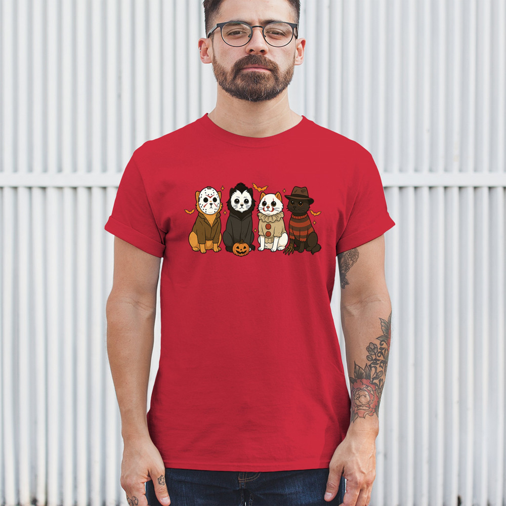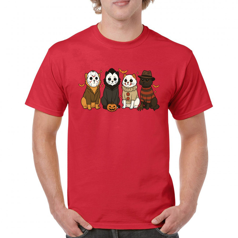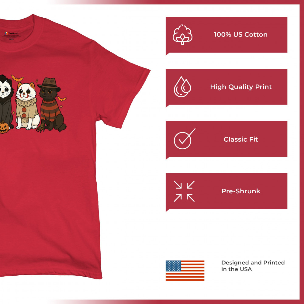 Horror Cats Halloween design with spooky costumes, Jack o Lantern details, and Haunted House vibes. Perfect October 31 outfit for cat lovers.