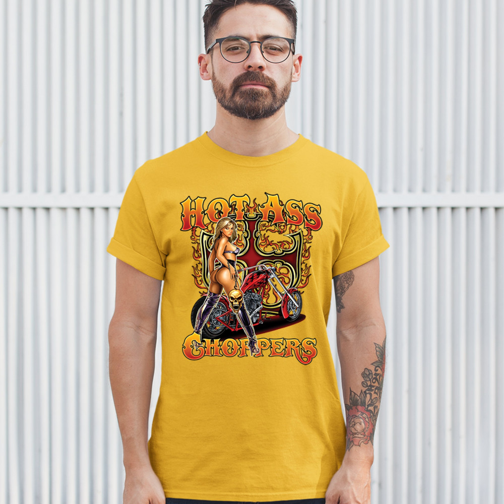 HOT ASS CHOPPERS t-shirt born to be wild route 66 hot chick men's tee yellow