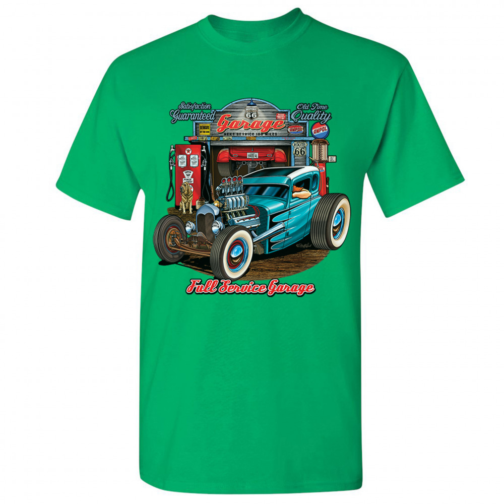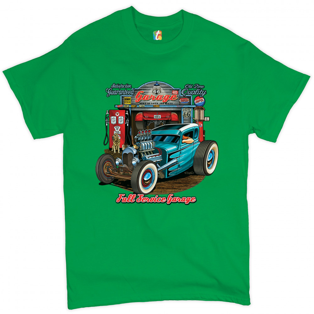 A print featuring a beautiful blue hot rod and a garage behind it. The garage has numerous signs on it which says :"Satisfaction guaranteed", "Old time quality", "Historic Route 66". Under the car it says: "Full service garage". Great for Route 66 and hot rod fans.