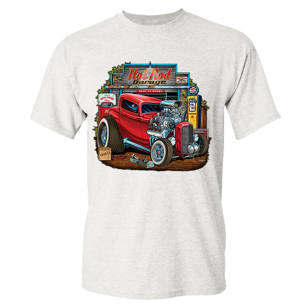 A print featuring a vintage hot rod with an exposed engine and plus-sized rear wheels. In the background there is a garage with a gas station and a sign that says: "Hot Rod Garage". A great choice for a fan of customized American classic cars and hot rods