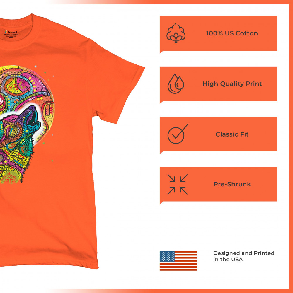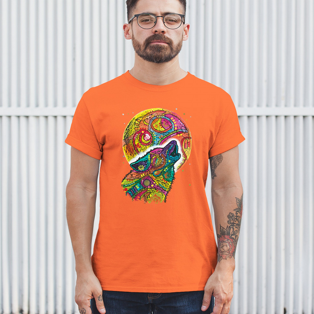 HOWLING WOLF AND MOON t-shirt dean russo colorful wild life men's tee orange