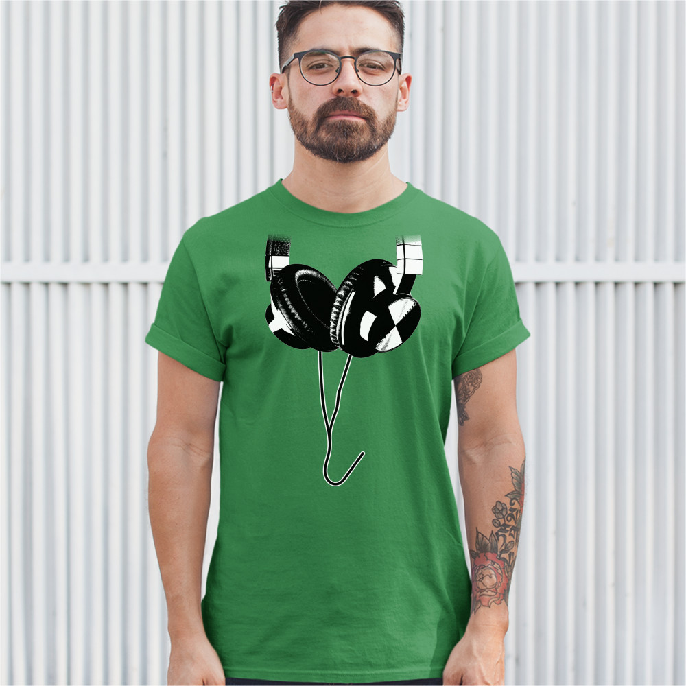 HUGE HANGING HEADPHONES t-shirt dj music men's tee green