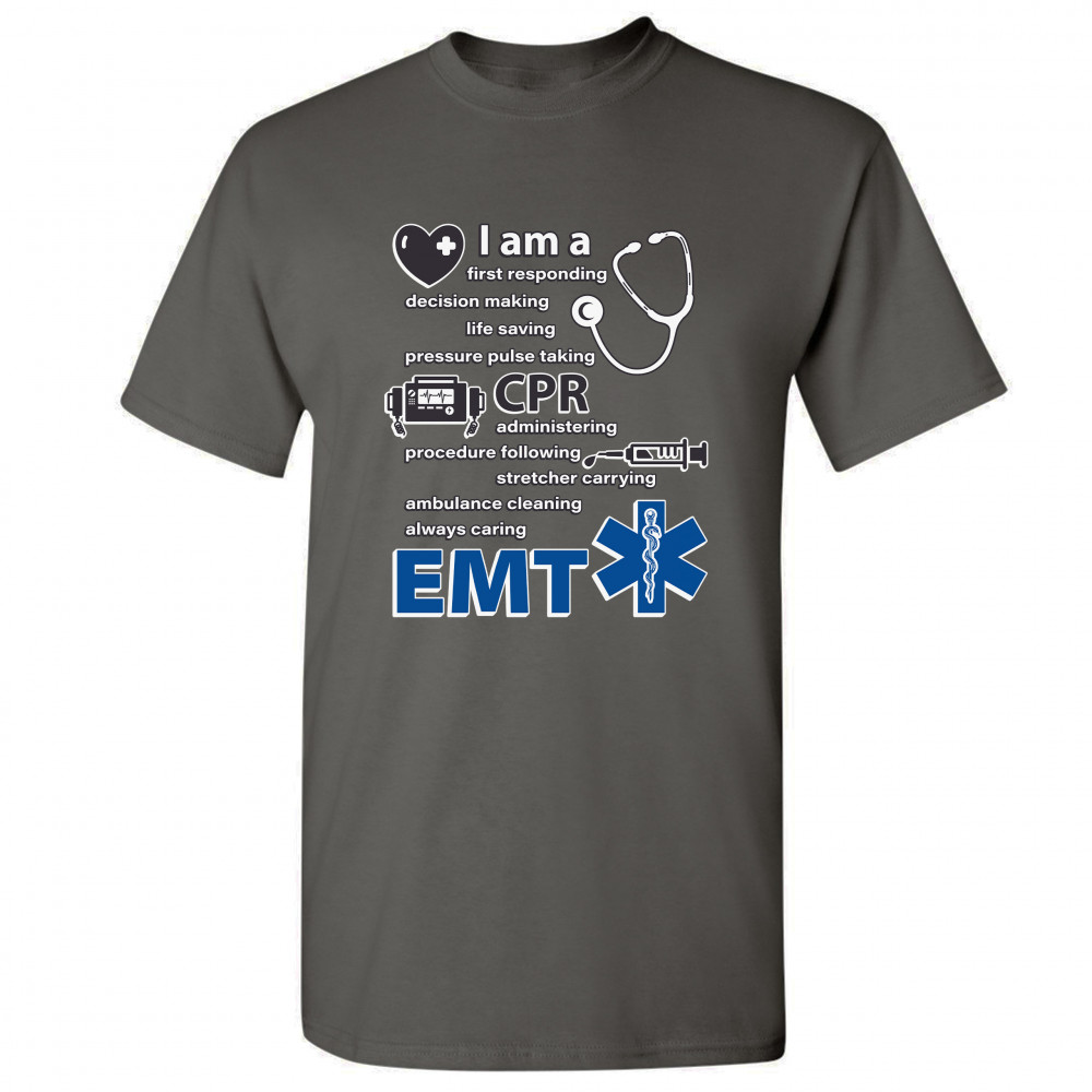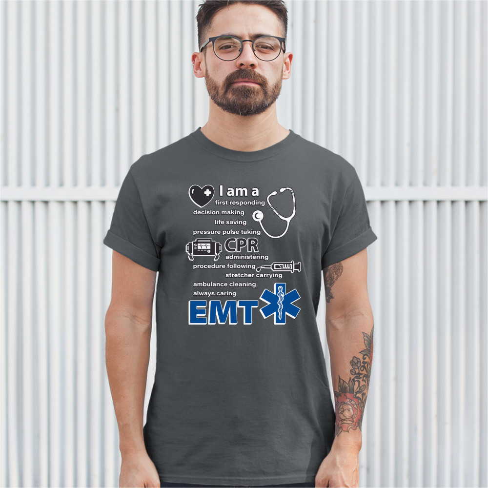 A print saying "I am a first responding, decision making, life saving, pressure pulse taking, CPR administering, procedure following, stretcher carrying, ambulance cleaning, always caring EMT". The print also features images of a heart, a stethoscope, a defibrillator, a syringe and the Star of Life. A great choice as a gift for a first responder.