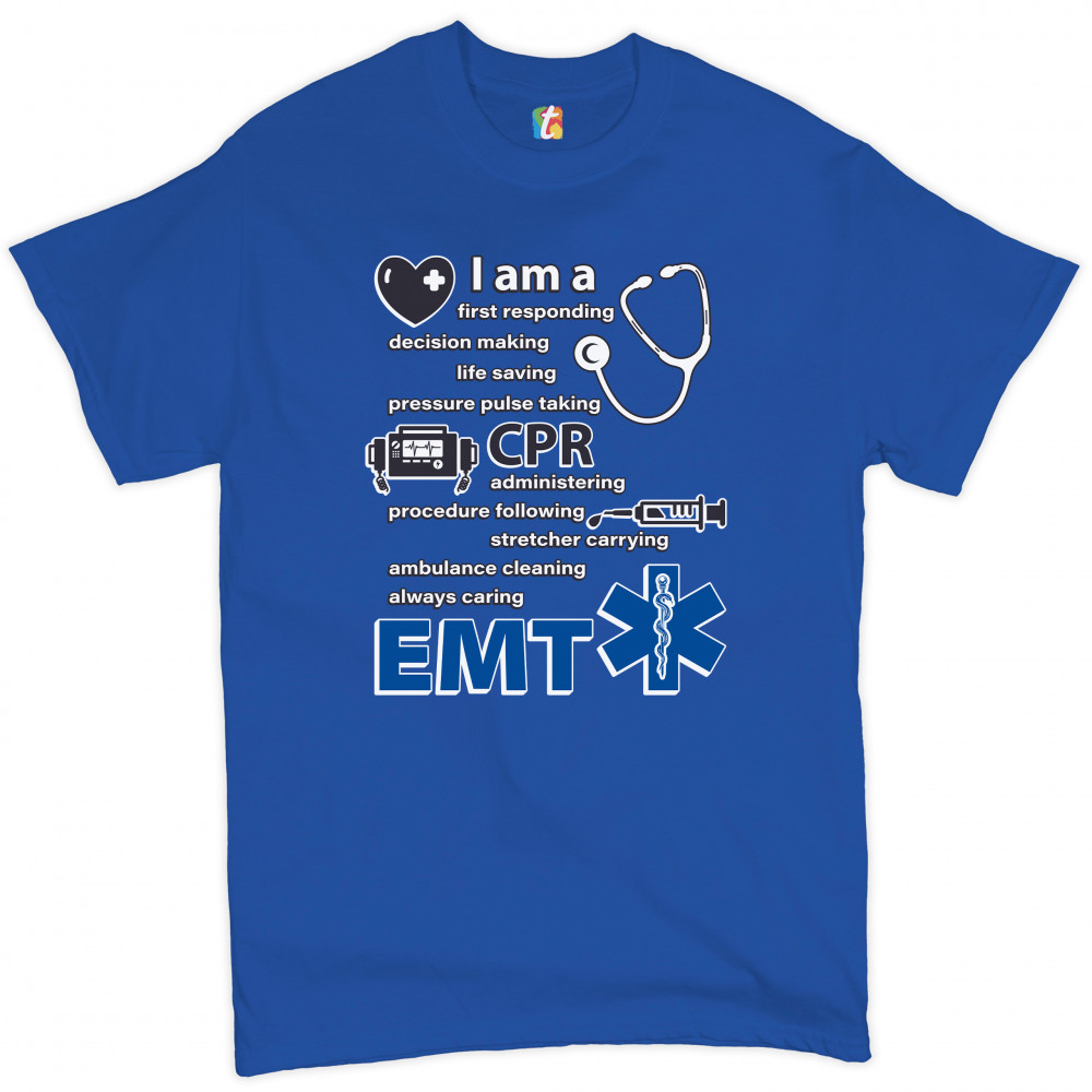 A print saying "I am a first responding, decision making, life saving, pressure pulse taking, CPR administering, procedure following, stretcher carrying, ambulance cleaning, always caring EMT". The print also features images of a heart, a stethoscope, a defibrillator, a syringe and the Star of Life. A great choice as a gift for a first responder.