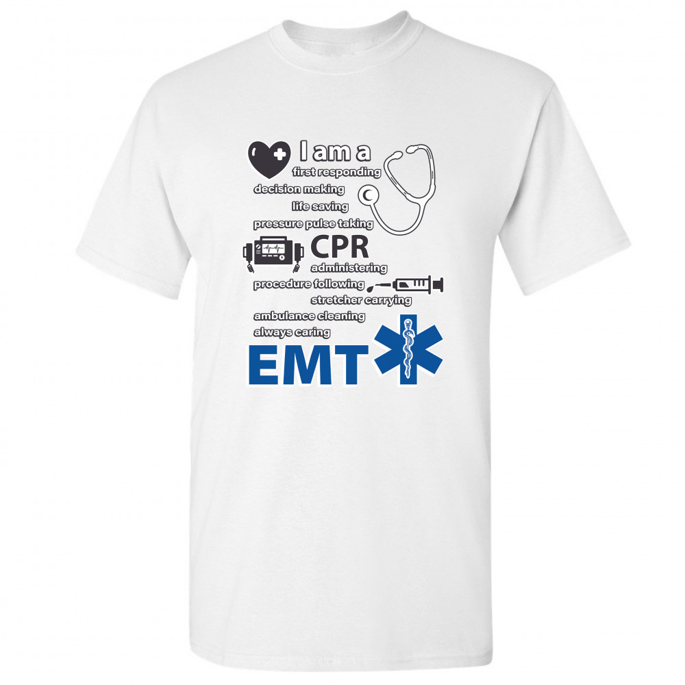 A print saying "I am a first responding, decision making, life saving, pressure pulse taking, CPR administering, procedure following, stretcher carrying, ambulance cleaning, always caring EMT". The print also features images of a heart, a stethoscope, a defibrillator, a syringe and the Star of Life. A great choice as a gift for a first responder.
