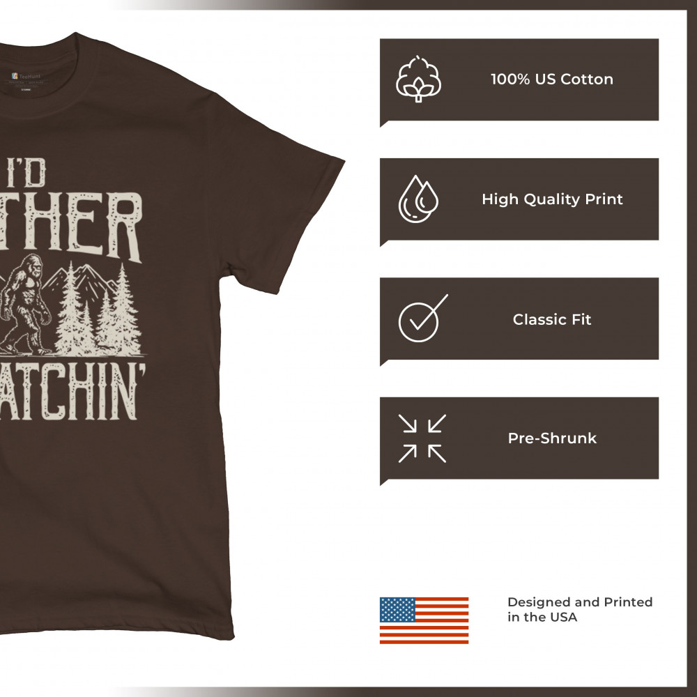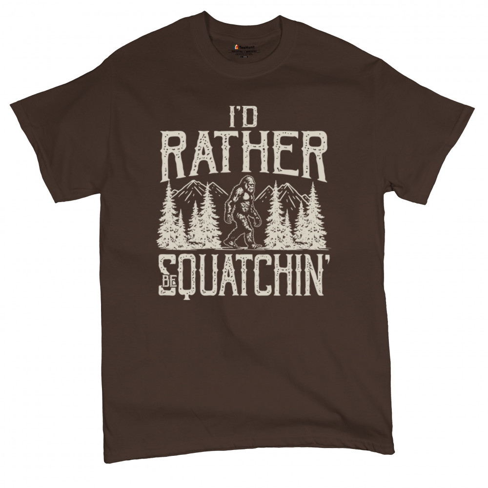 "I’d Rather Be Squatchin’" – A bold design for Bigfoot fans and outdoor adventurers, featuring Sasquatch in a wilderness setting. Perfect for hikers and cryptid enthusiasts!