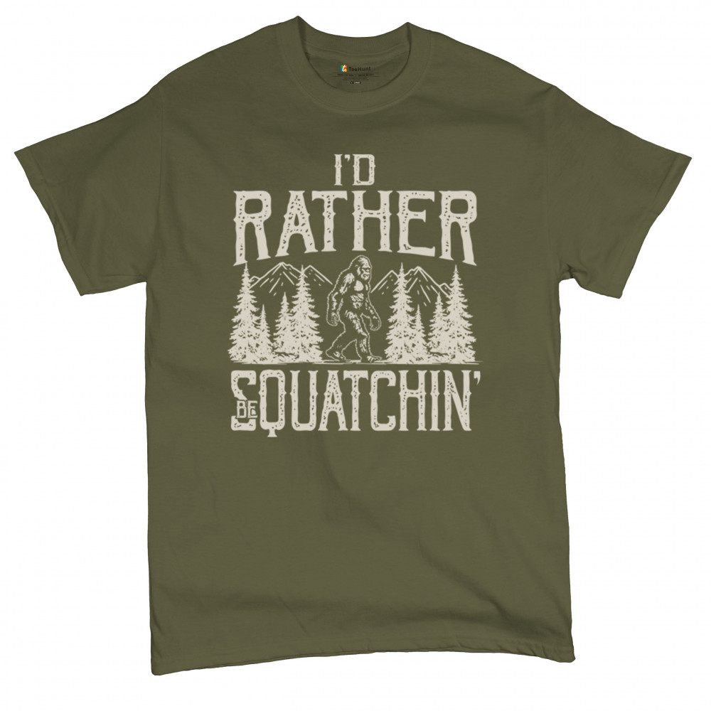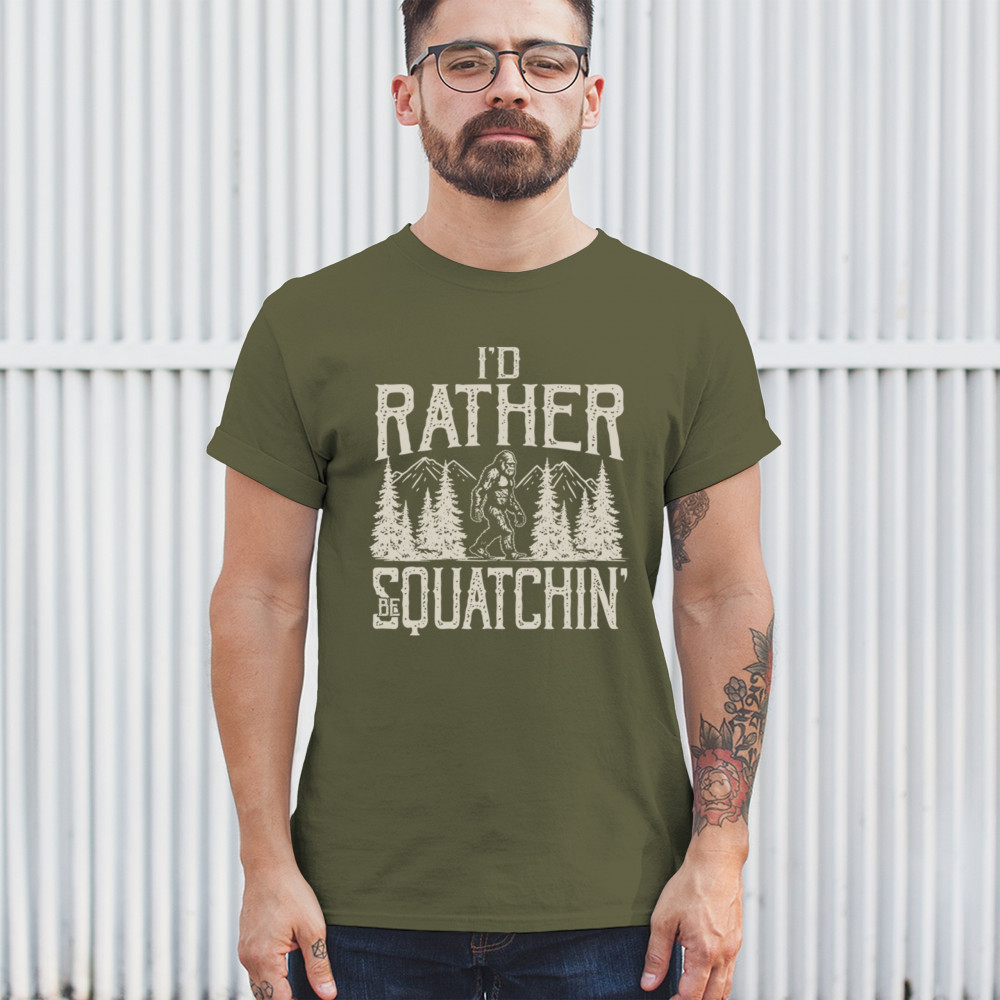 "I’d Rather Be Squatchin’" – A bold design for Bigfoot fans and outdoor adventurers, featuring Sasquatch in a wilderness setting. Perfect for hikers and cryptid enthusiasts!