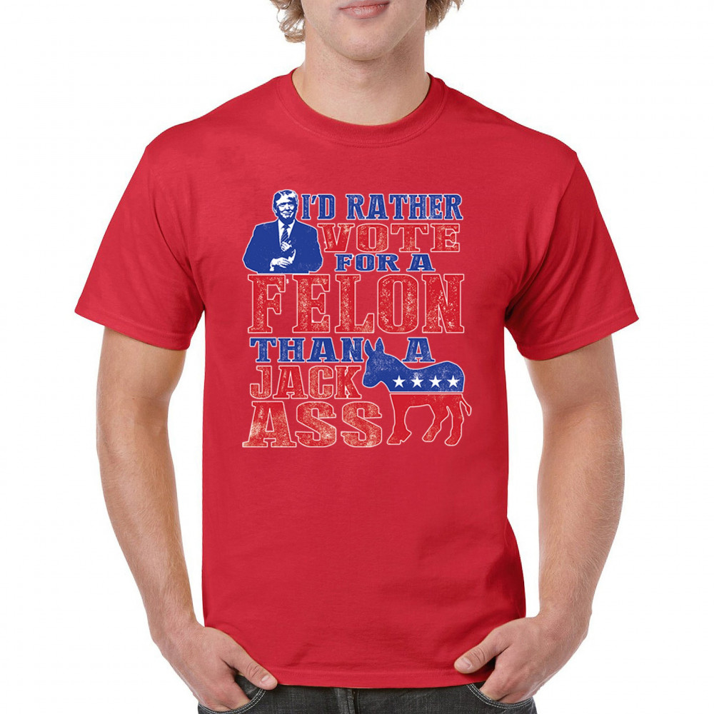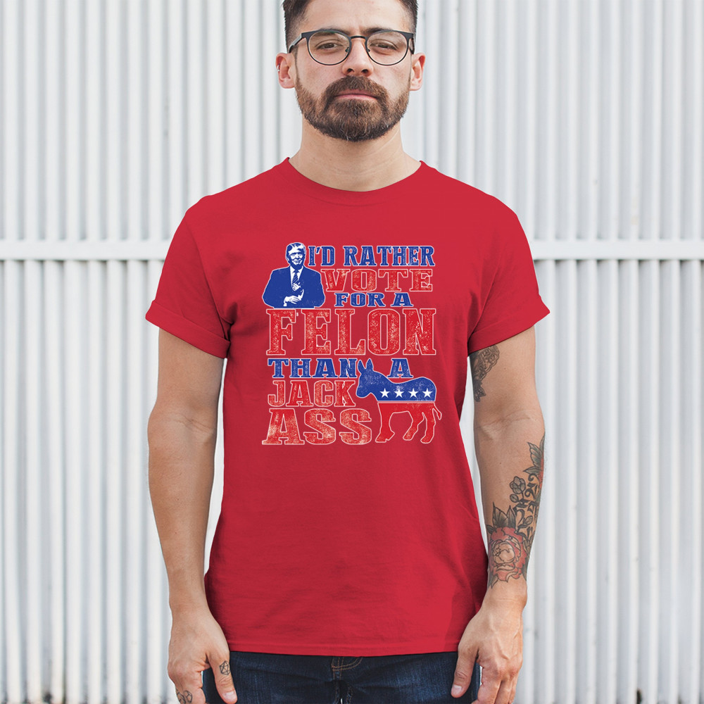 Boldly express your support with the "I'd Rather Vote For A Felon Than A Jackass" design. Perfect for rallies, it showcases loyalty to Trump and JD Vance.