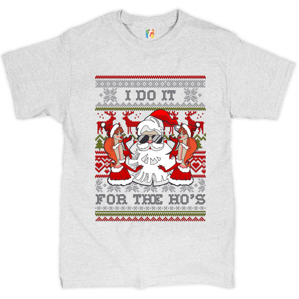 A funny print saying: "I do it for the ho's". It features a badass Santa Claus wearing sunglasses and two sexy girls in revealing Christmas outfits leaning on Santa's beard. The print is decorated wit the ugly sweater pattern in the background. Amazing ch