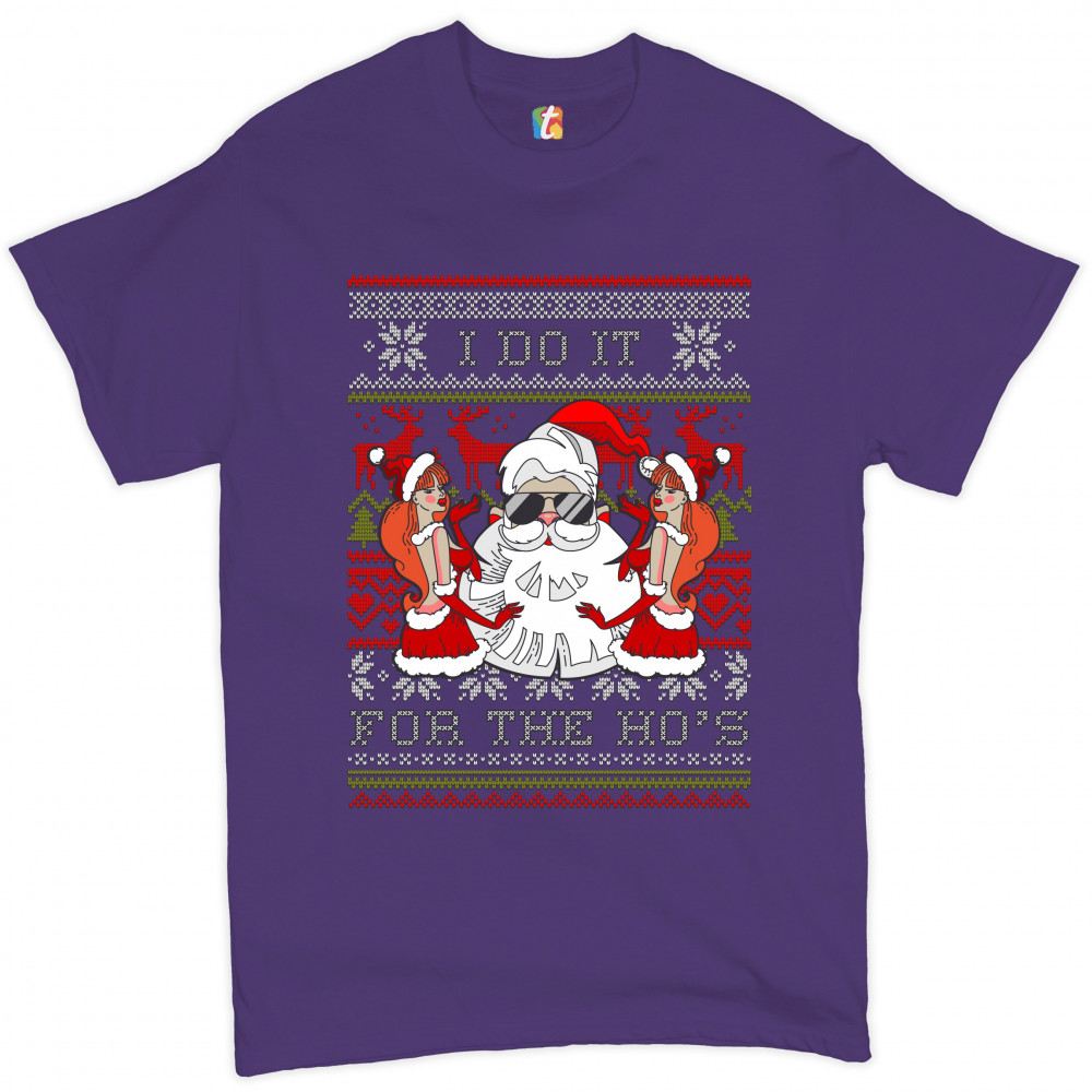 A funny print saying: "I do it for the ho's". It features a badass Santa Claus wearing sunglasses and two sexy girls in revealing Christmas outfits leaning on Santa's beard. The print is decorated wit the ugly sweater pattern in the background. Amazing ch