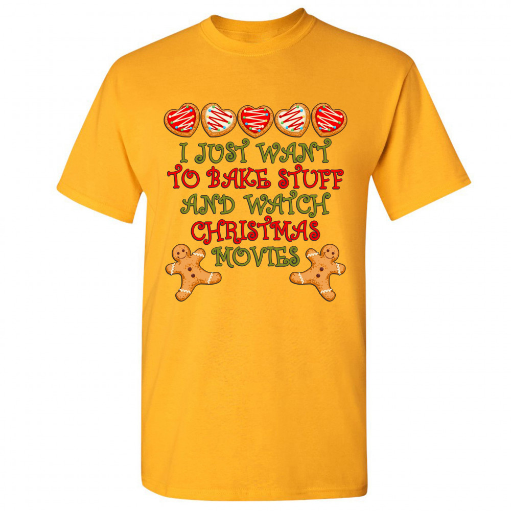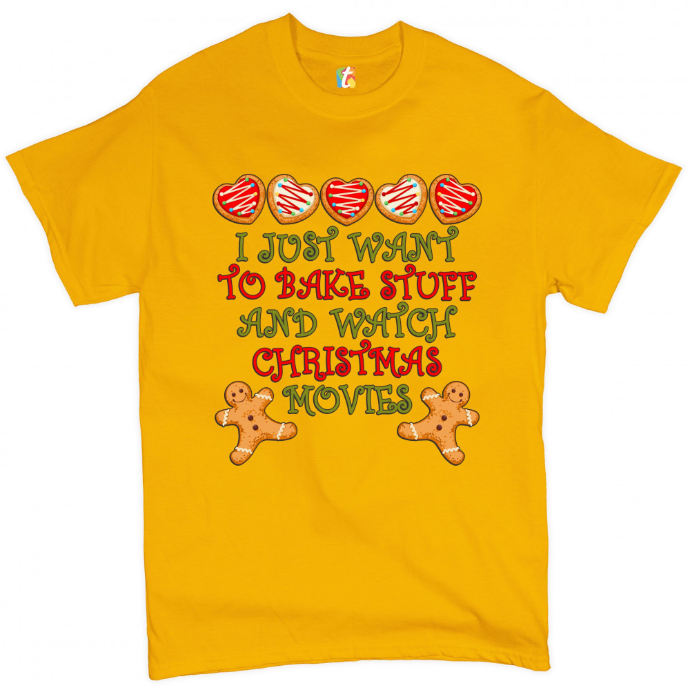 I JUST WANT TO BAKE STUFF AND WATCH CHRISTMAS MOVIES t-shirt xmas men's tee yellow
