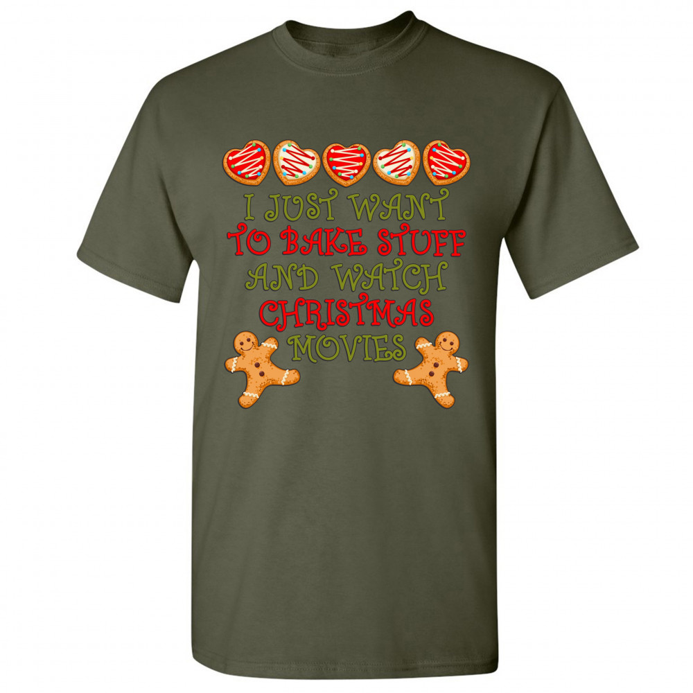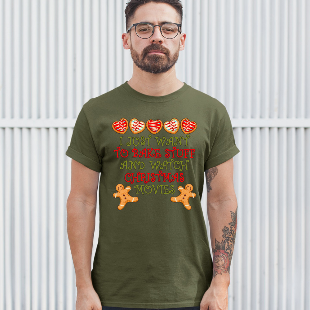 I JUST WANT TO BAKE STUFF AND WATCH CHRISTMAS MOVIES t-shirt xmas men's tee military green