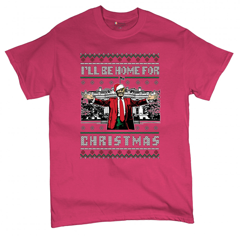 Get into the Christmas spirit with the "I'll Be Home for Christmas" design featuring Donald J. Trump in a festive holiday setting. Perfect for ugly sweater contests, holiday gatherings, and unique gifts for supporters, this humorous design adds a bold, patriotic touch to your seasonal celebrations. Whether for cozy mornings or office parties, it's a must-have for holiday cheer.