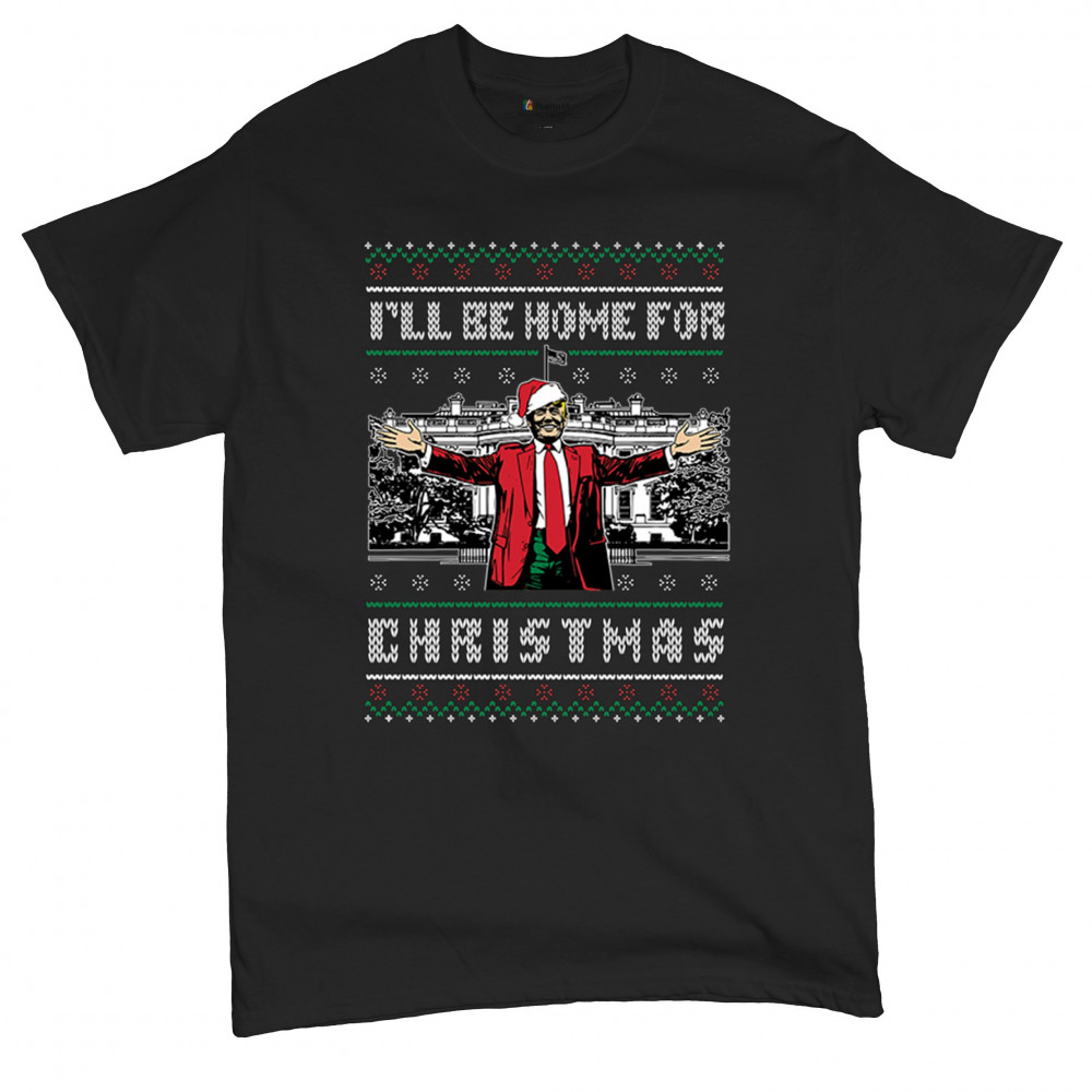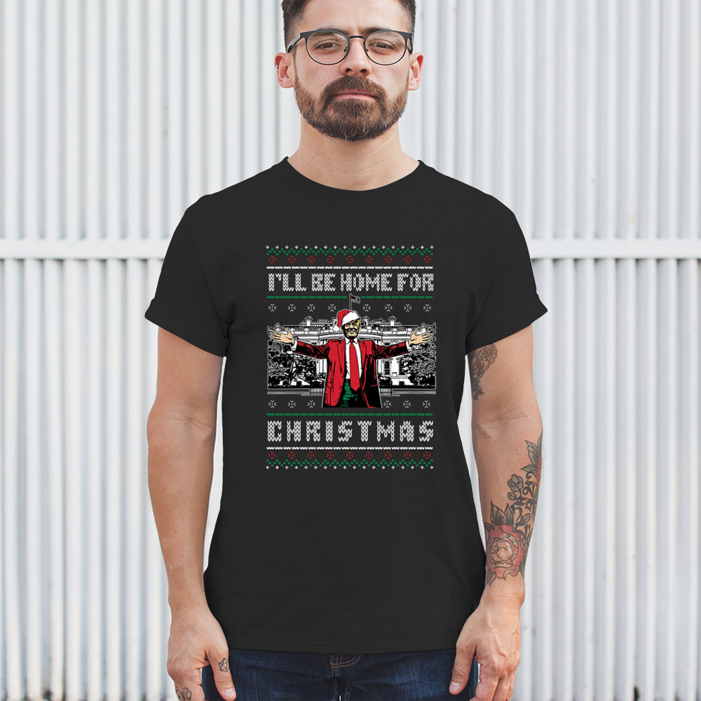 Get into the Christmas spirit with the "I'll Be Home for Christmas" design featuring Donald J. Trump in a festive holiday setting. Perfect for ugly sweater contests, holiday gatherings, and unique gifts for supporters, this humorous design adds a bold, patriotic touch to your seasonal celebrations. Whether for cozy mornings or office parties, it's a must-have for holiday cheer.