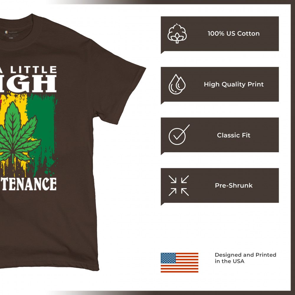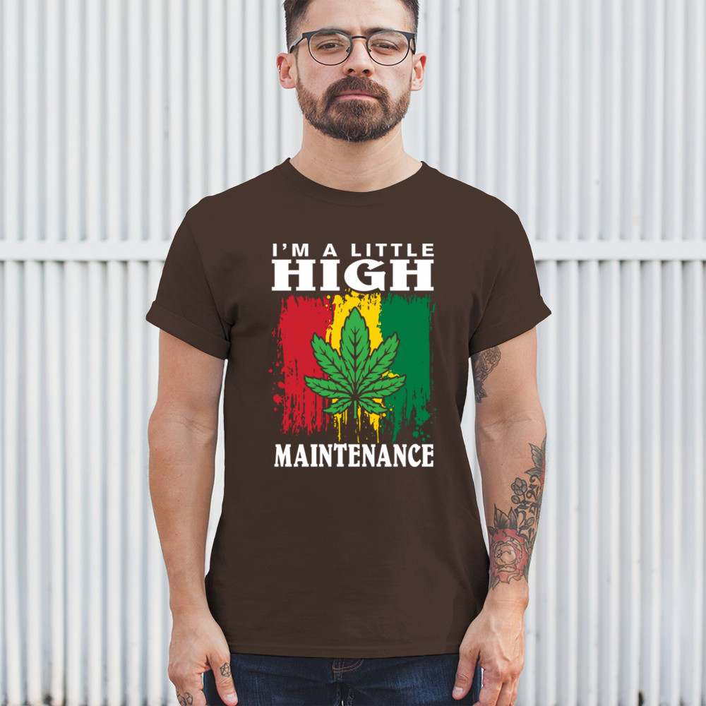 "I'm a Little High Maintenance" design with a bold cannabis leaf and vibrant background. Perfect for fans of Mary Jane, humor, and relaxed, trippy style.