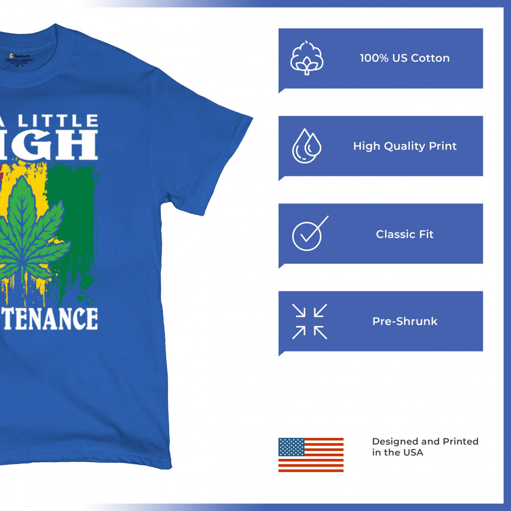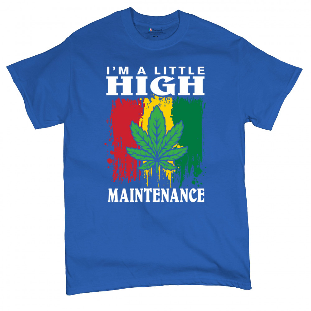"I'm a Little High Maintenance" design with a bold cannabis leaf and vibrant background. Perfect for fans of Mary Jane, humor, and relaxed, trippy style.