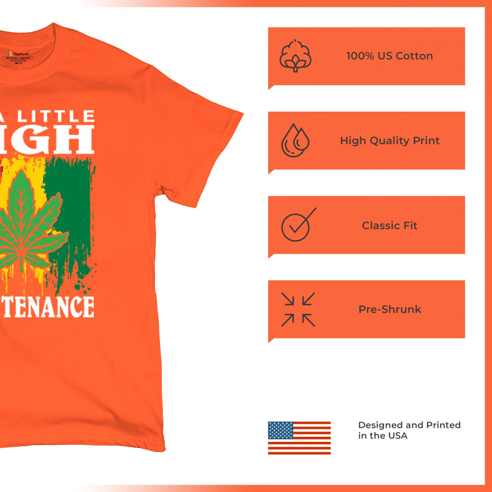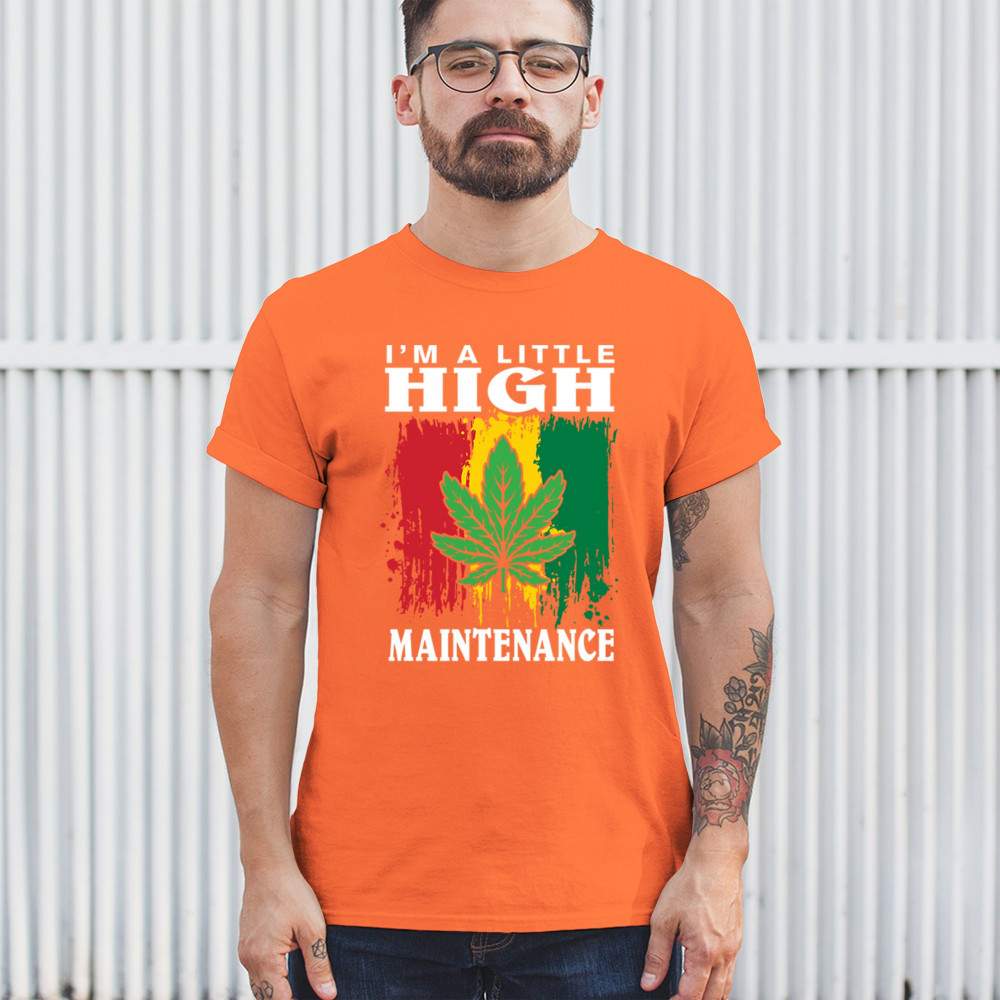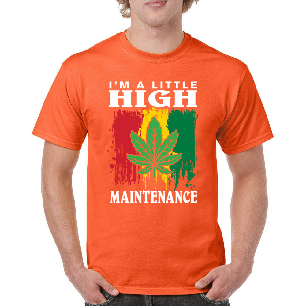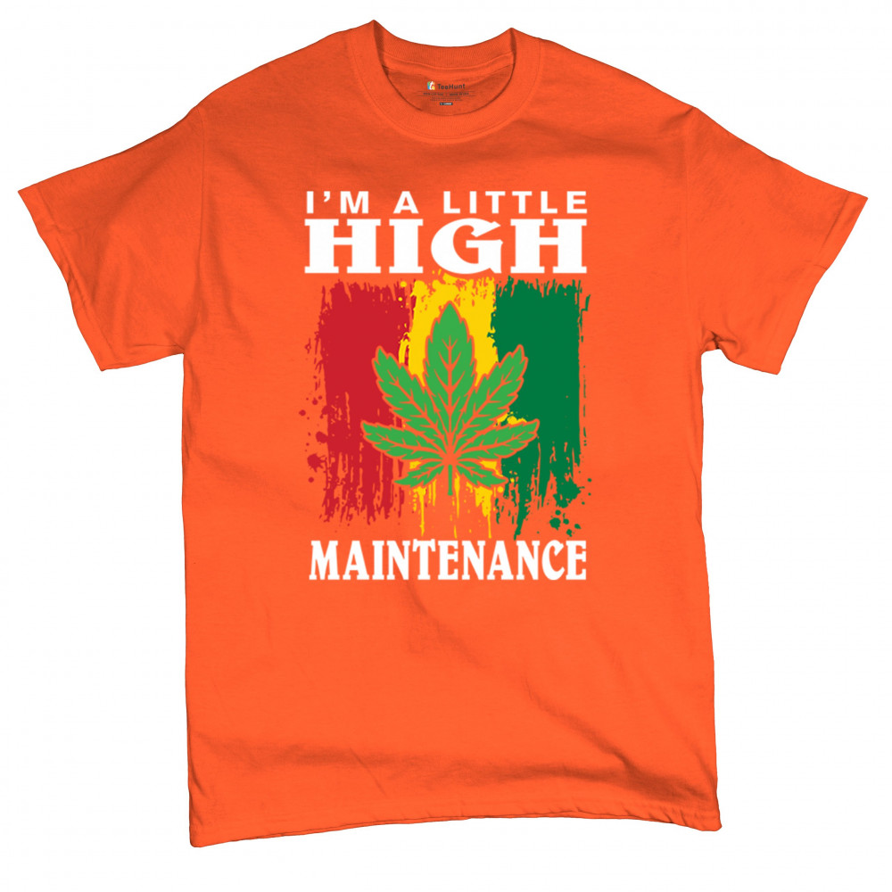 "I'm a Little High Maintenance" design with a bold cannabis leaf and vibrant background. Perfect for fans of Mary Jane, humor, and relaxed, trippy style.