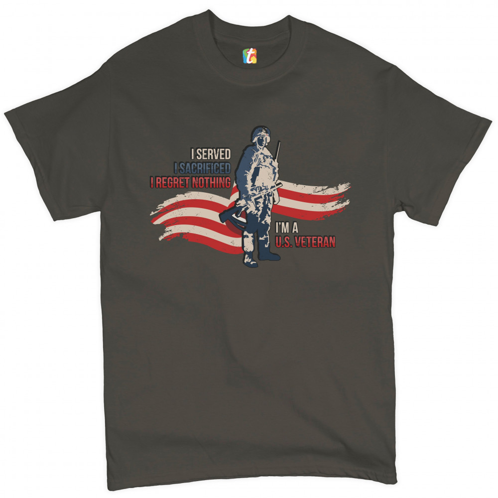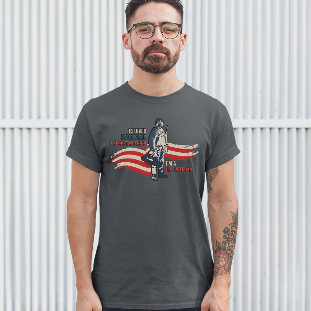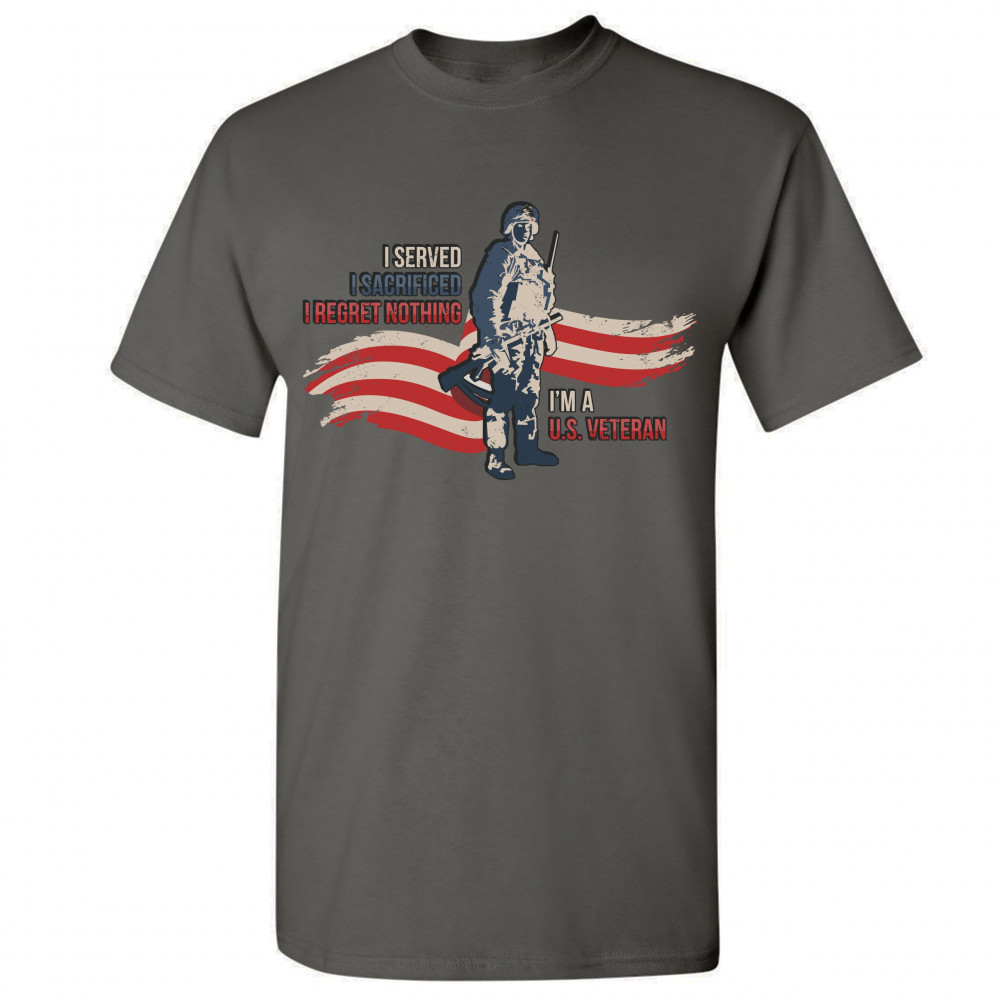 A patriotic print featuring a red-and-white stripe in the background and a soldier holding a rifle. The print says: "I Served I Sacrificed I Regreat Nothing I'm a U.S. Veteran". Great choice to wear on Independence Day or any other patriotic holiday.