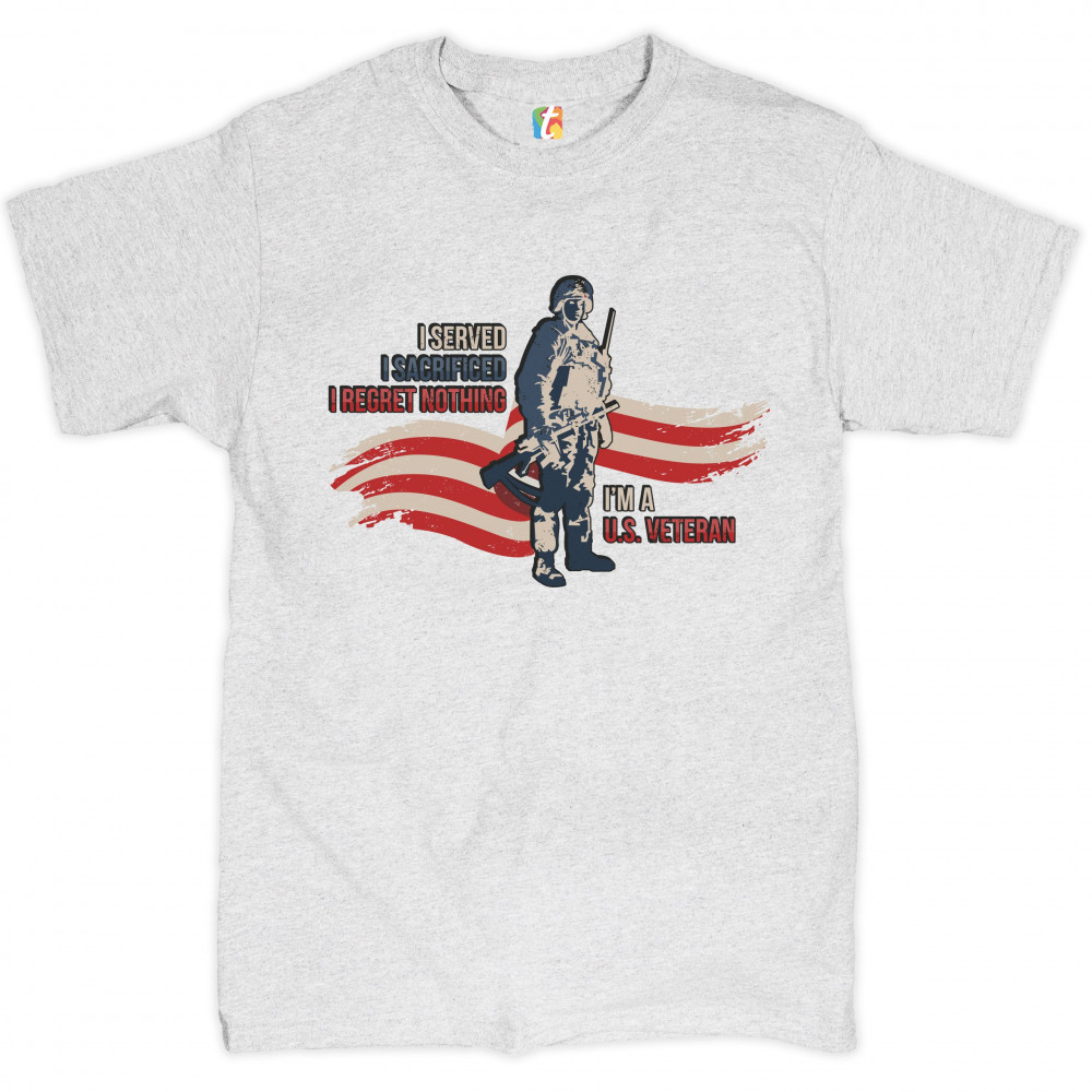A patriotic print featuring a red-and-white stripe in the background and a soldier holding a rifle. The print says: "I Served I Sacrificed I Regreat Nothing I'm a U.S. Veteran". Great choice to wear on Independence Day or any other patriotic holiday.