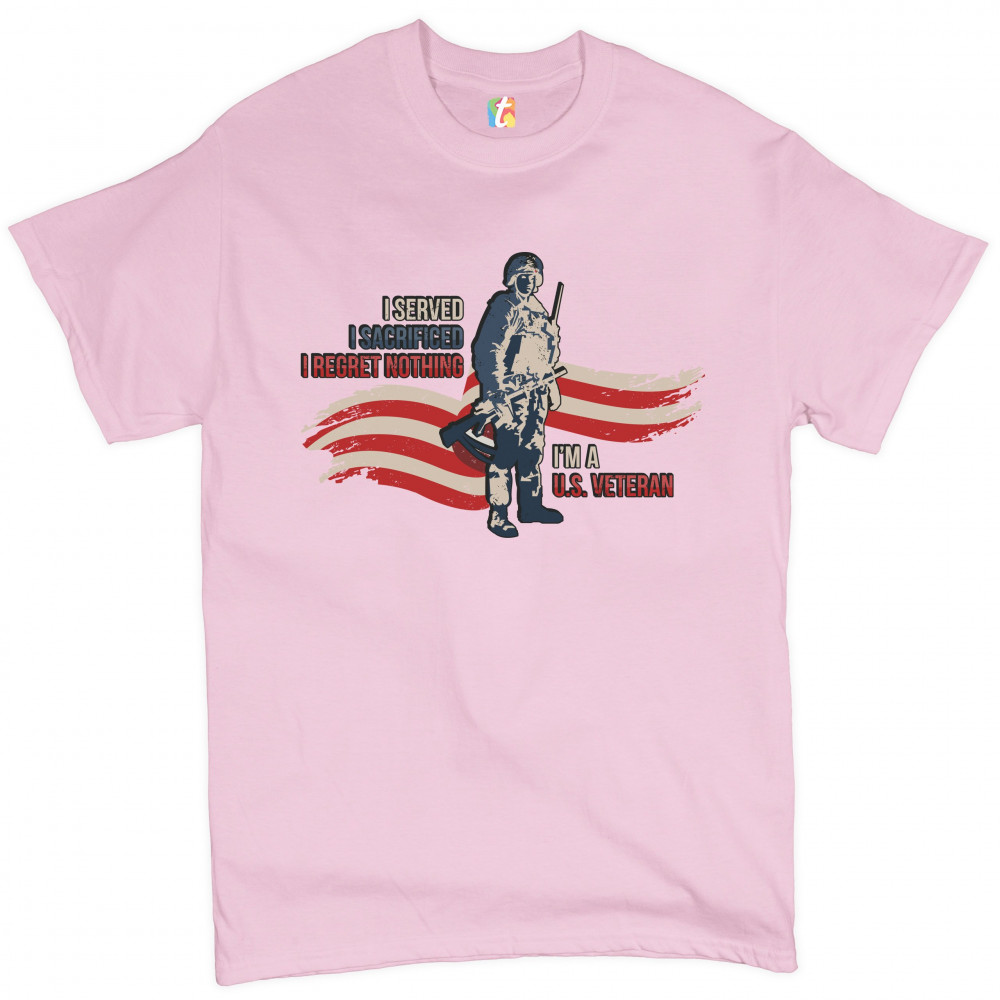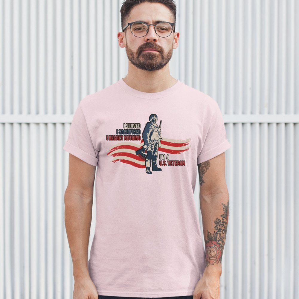 A patriotic print featuring a red-and-white stripe in the background and a soldier holding a rifle. The print says: "I Served I Sacrificed I Regreat Nothing I'm a U.S. Veteran". Great choice to wear on Independence Day or any other patriotic holiday.