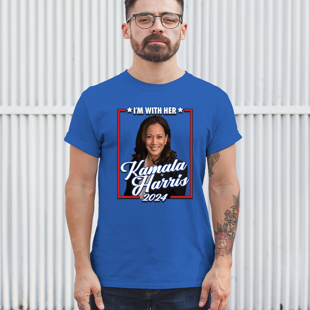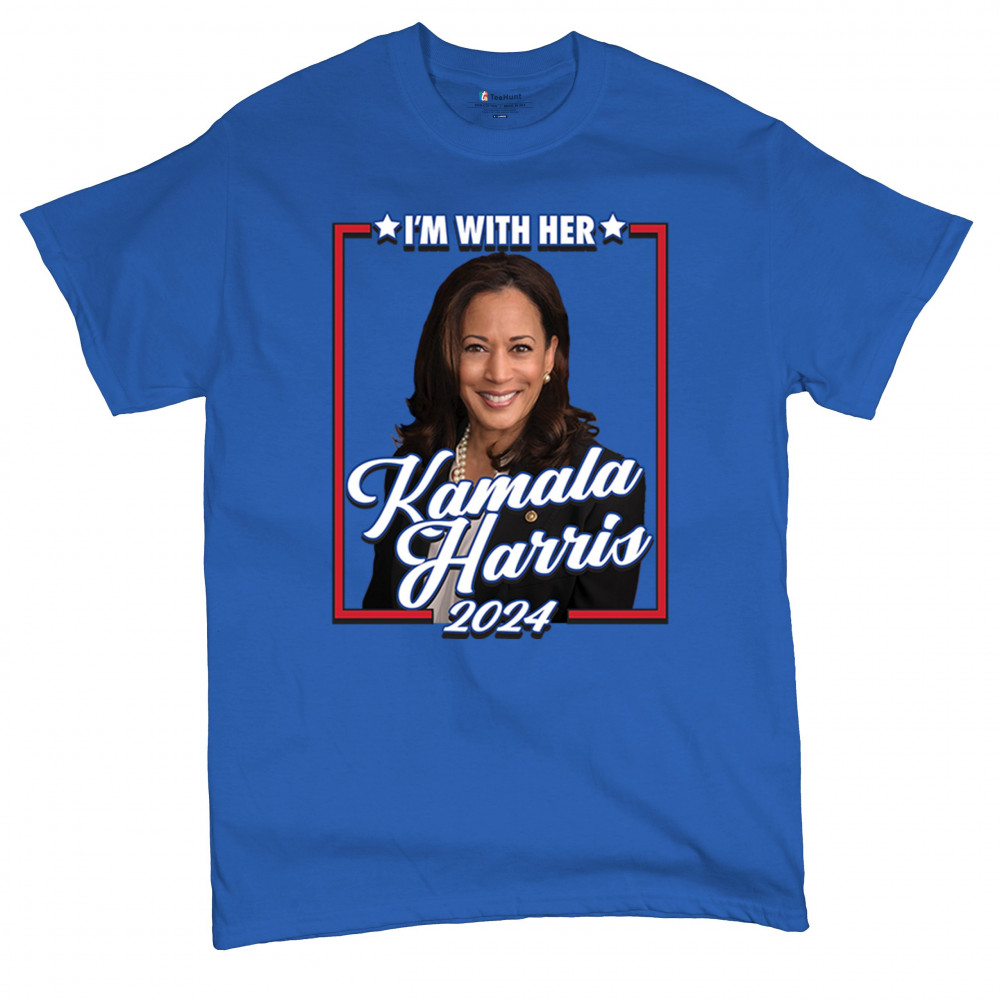 Stand with Kamala Harris in her 2024 presidential campaign with this vibrant design. Highlighting her commitment to progressive causes, this design is perfect for supporters of LGBTQ+ rights, women's rights, and social justice. Featuring the iconic "I'm With Her" slogan, it's a bold statement for anyone who believes in a brighter future. Wear it to rallies, events, or any day to show your support for Kamala Harris and her vision for America. A great addition to any supporter’s collection!