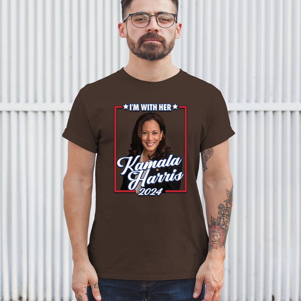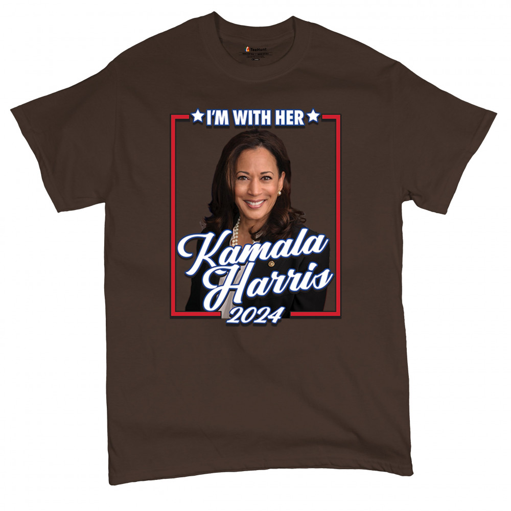Stand with Kamala Harris in her 2024 presidential campaign with this vibrant design. Highlighting her commitment to progressive causes, this design is perfect for supporters of LGBTQ+ rights, women's rights, and social justice. Featuring the iconic "I'm With Her" slogan, it's a bold statement for anyone who believes in a brighter future. Wear it to rallies, events, or any day to show your support for Kamala Harris and her vision for America. A great addition to any supporter’s collection!