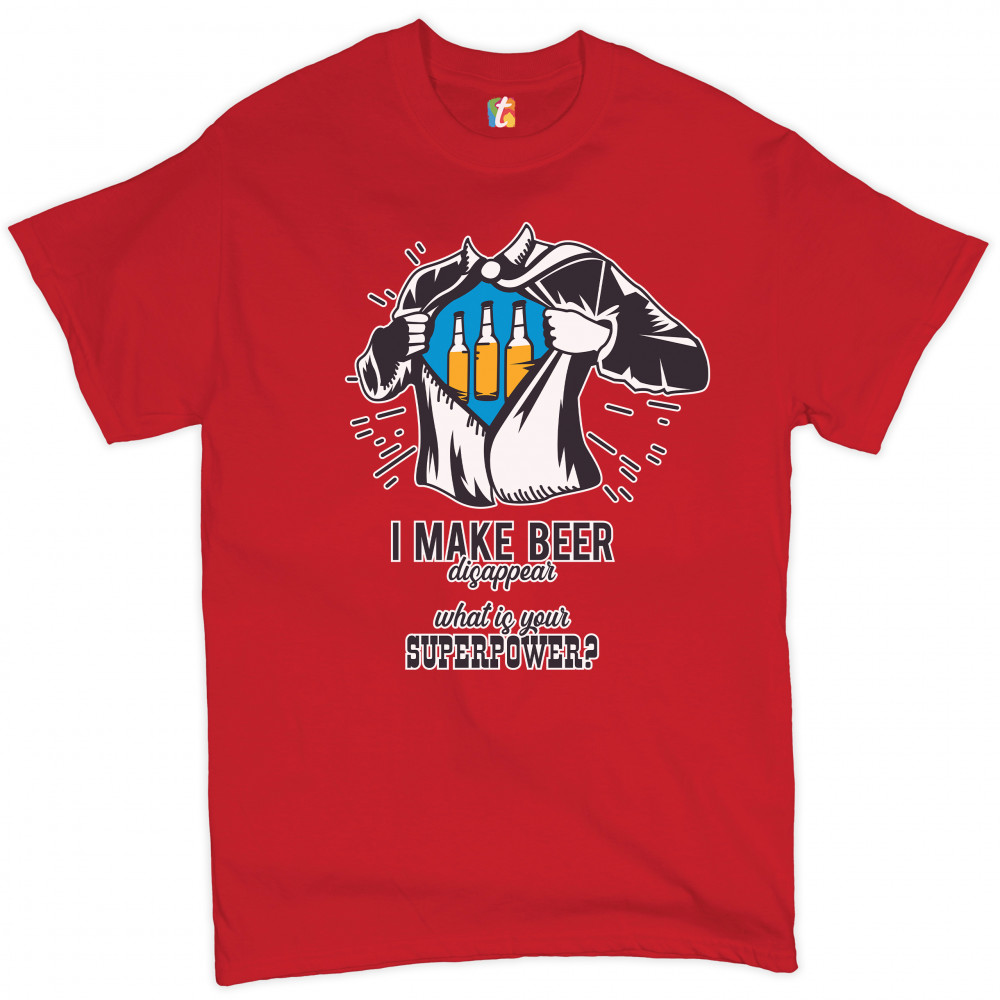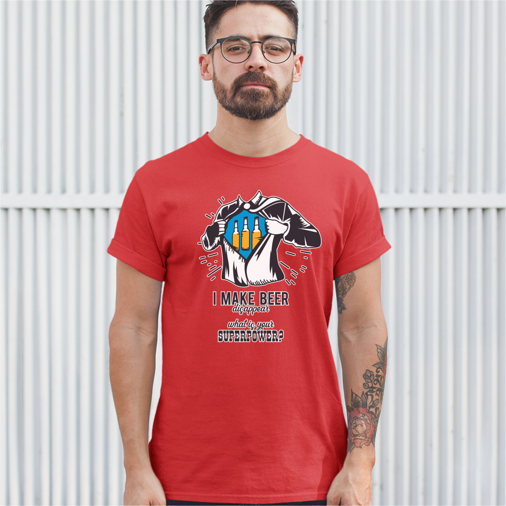 A funny print featuring a torso of man, who is ripping his shirt, exposing a picture of three bottles of beer. Underneath the picture the print says: "I make beer disappear. What is your superpower?". Great choice as a gift for Father's Day celebration.