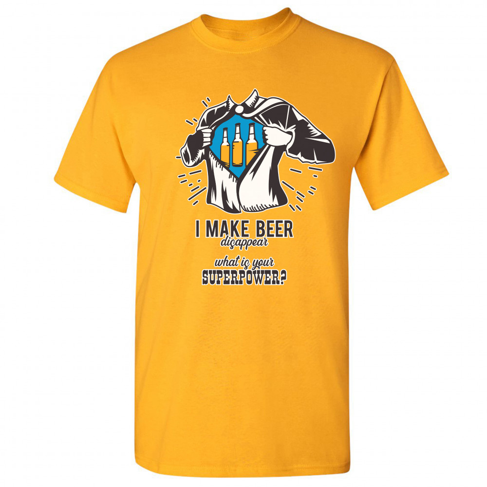 A funny print featuring a torso of man, who is ripping his shirt, exposing a picture of three bottles of beer. Underneath the picture the print says: "I make beer disappear. What is your superpower?". Great choice as a gift for Father's Day celebration.