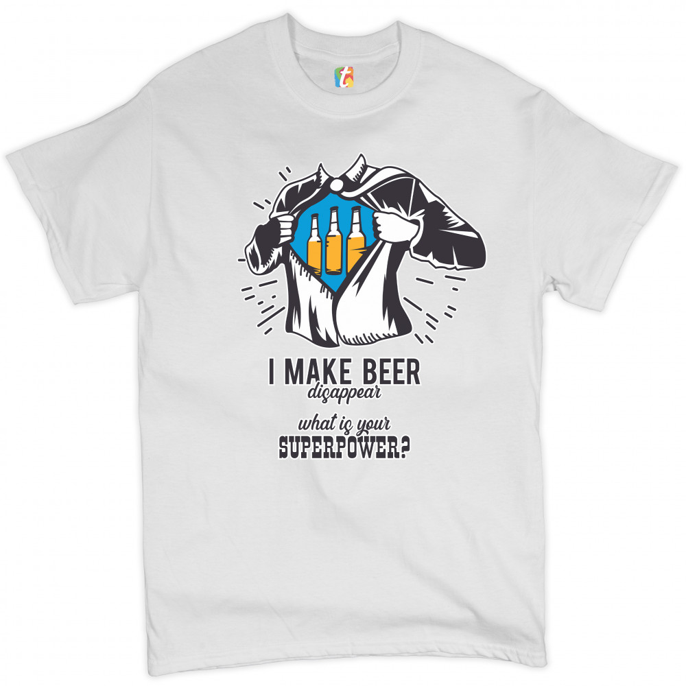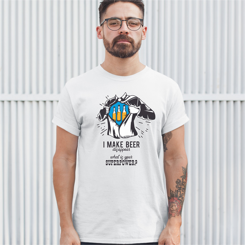 A funny print featuring a torso of man, who is ripping his shirt, exposing a picture of three bottles of beer. Underneath the picture the print says: "I make beer disappear. What is your superpower?". Great choice as a gift for Father's Day celebration.