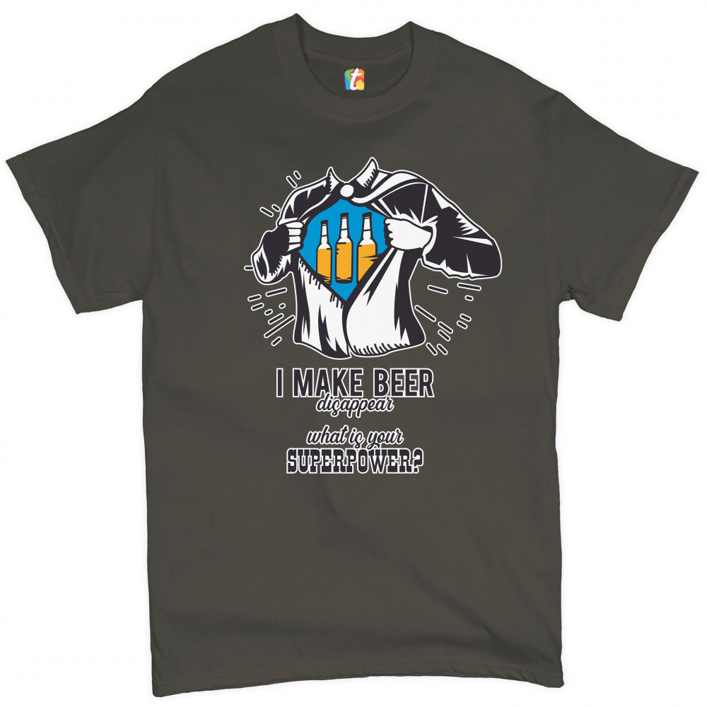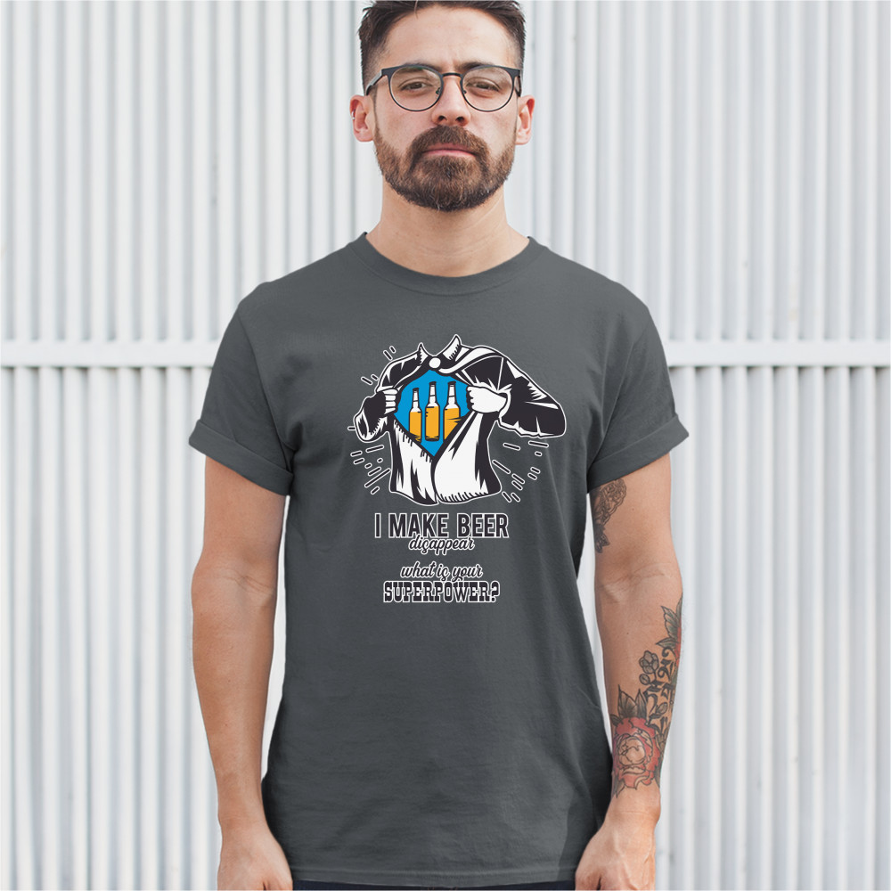 A funny print featuring a torso of man, who is ripping his shirt, exposing a picture of three bottles of beer. Underneath the picture the print says: "I make beer disappear. What is your superpower?". Great choice as a gift for Father's Day celebration.