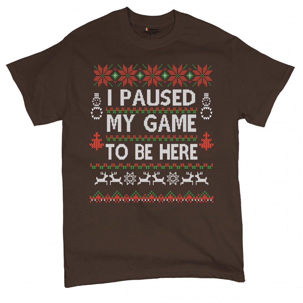 I PAUSED MY GAME TO BE HERE UGLY SWEATER THEME t-shirt christmas men's tee brown