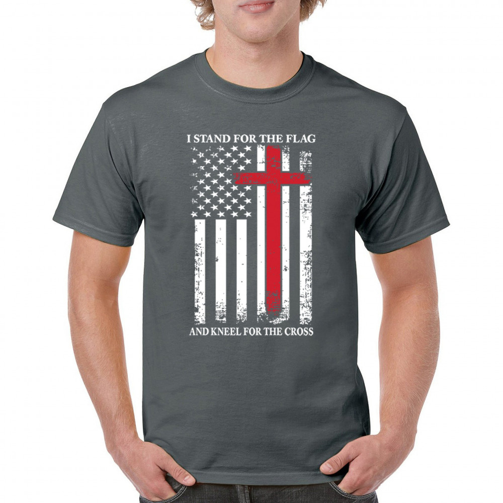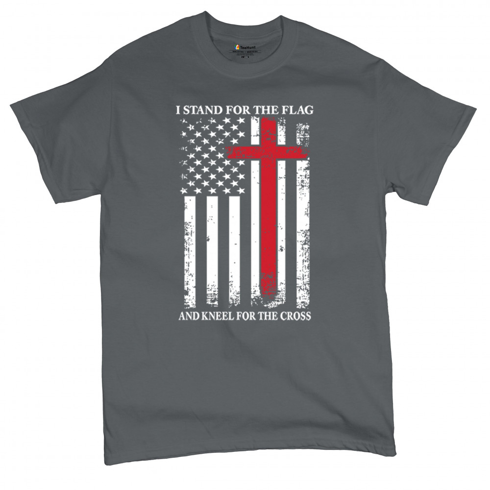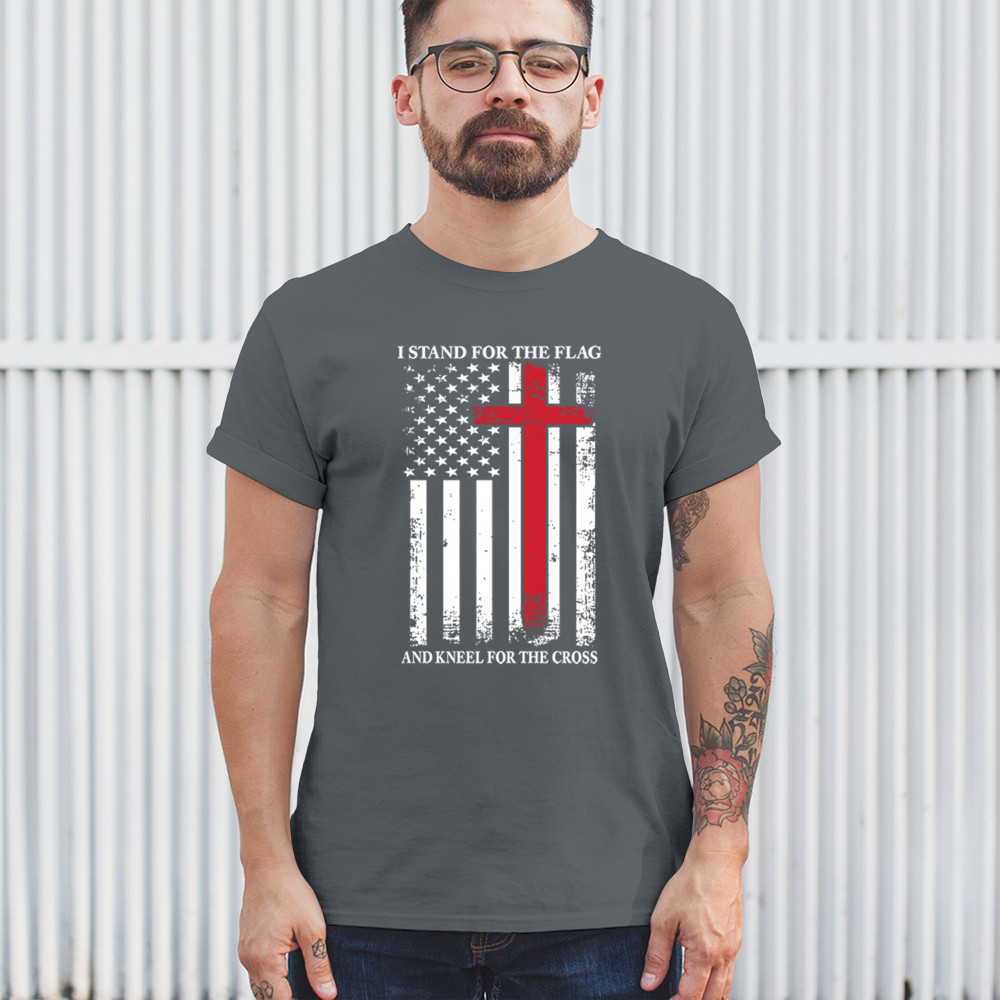 Celebrate faith and country with our Stand for the Flag Kneel for the Cross design. Featuring iconic symbols like the American flag and the Punisher emblem, this shirt is a testament to Christian principles and patriotism. A must-have for those seeking Trump merchandise and expressing unwavering support for the military.