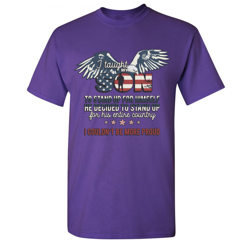 A patriotic print saying: "I Taught My Son to Stand up for Himself, He Decided to Stand Up for His Entire Country, I Couldn't Be More Proud". The print features a bald eagle, several stars and a small silhouette of a soldier inside of a letter "O" in "Son