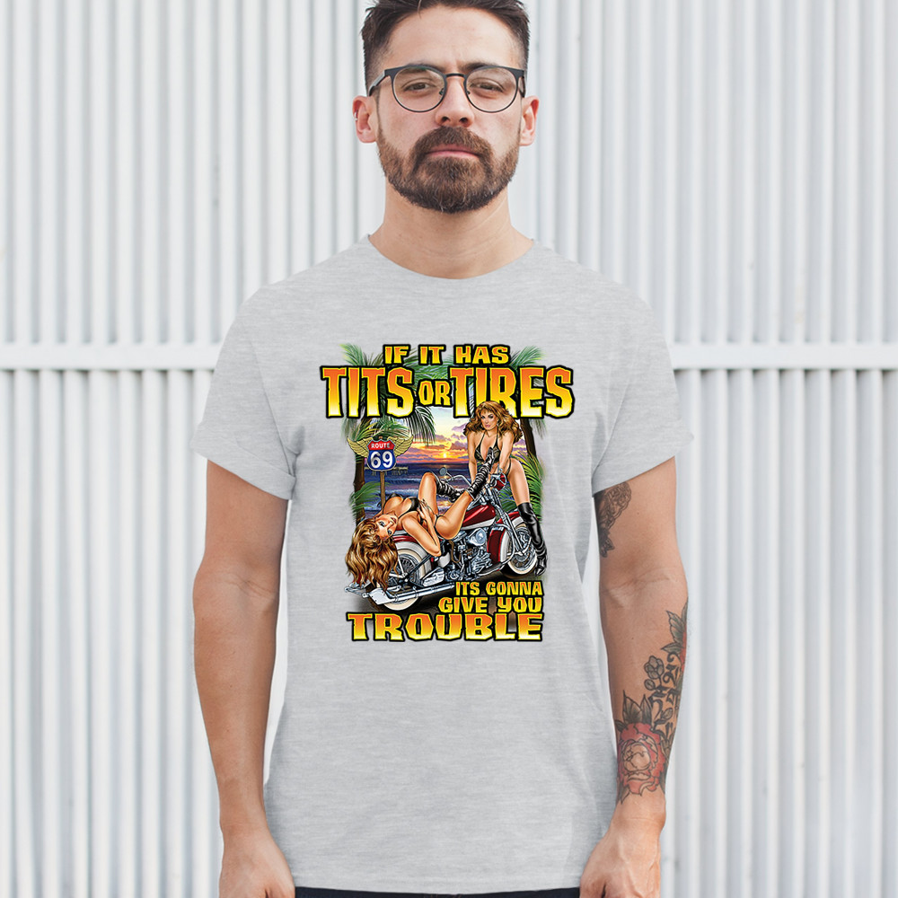A print featuring two barely dressed sexy women leaning on a vintage motorcycle parked at the beach. There is a "Route 69" road sign in the background. The print says: "If it has tits or tires it's gonna give you trouble". A great choice for a motorcycle
