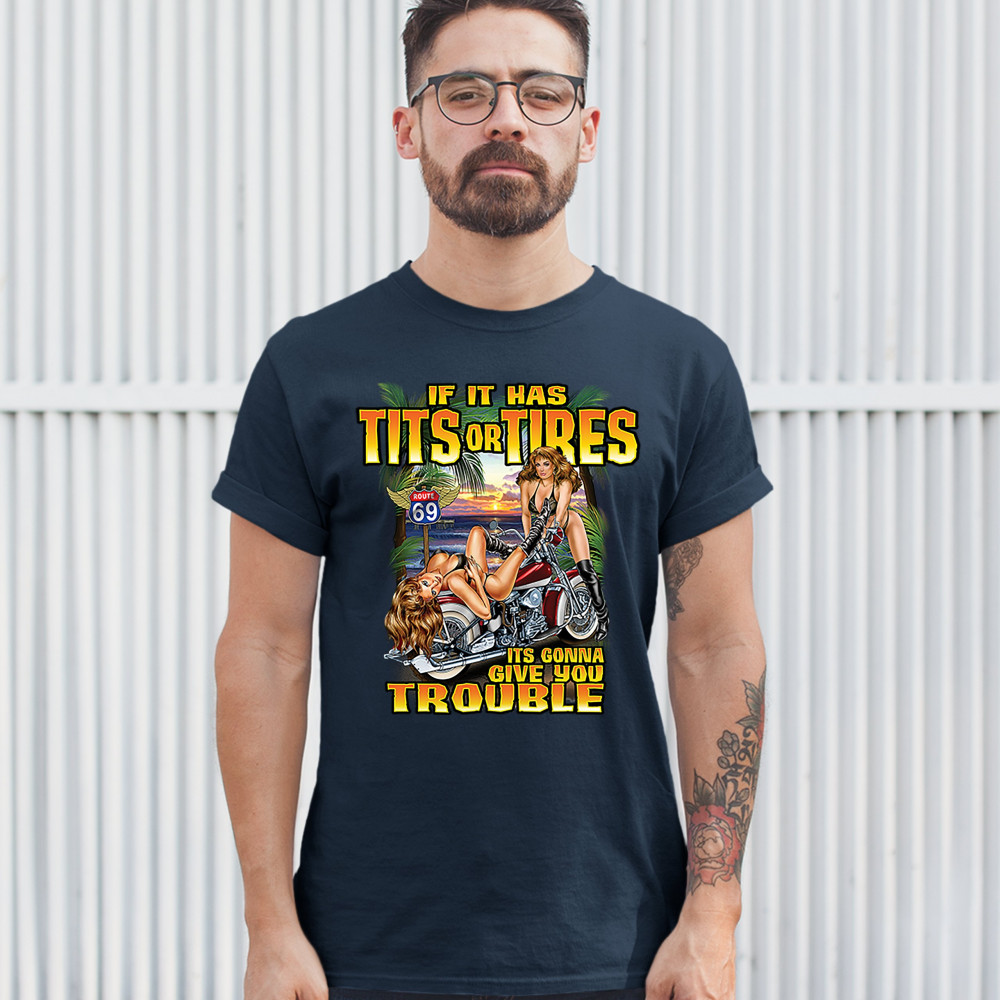 A print featuring two barely dressed sexy women leaning on a vintage motorcycle parked at the beach. There is a "Route 69" road sign in the background. The print says: "If it has tits or tires it's gonna give you trouble". A great choice for a motorcycle
