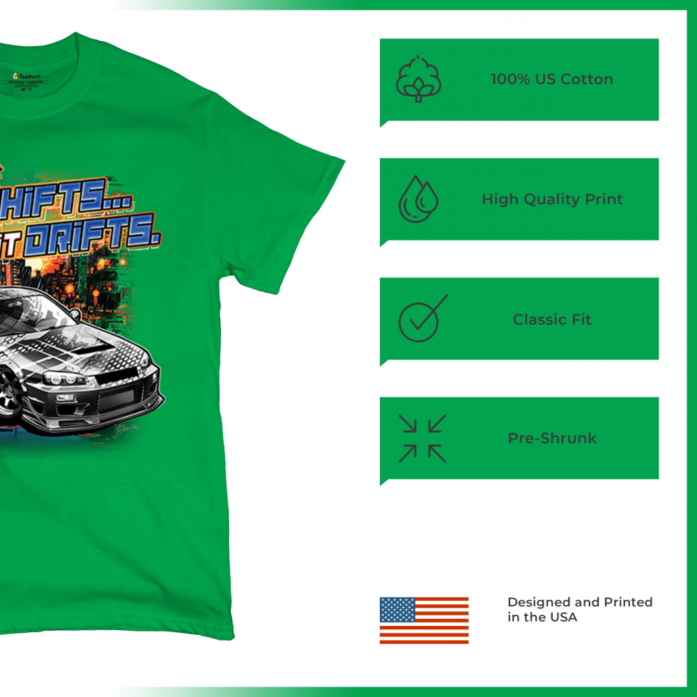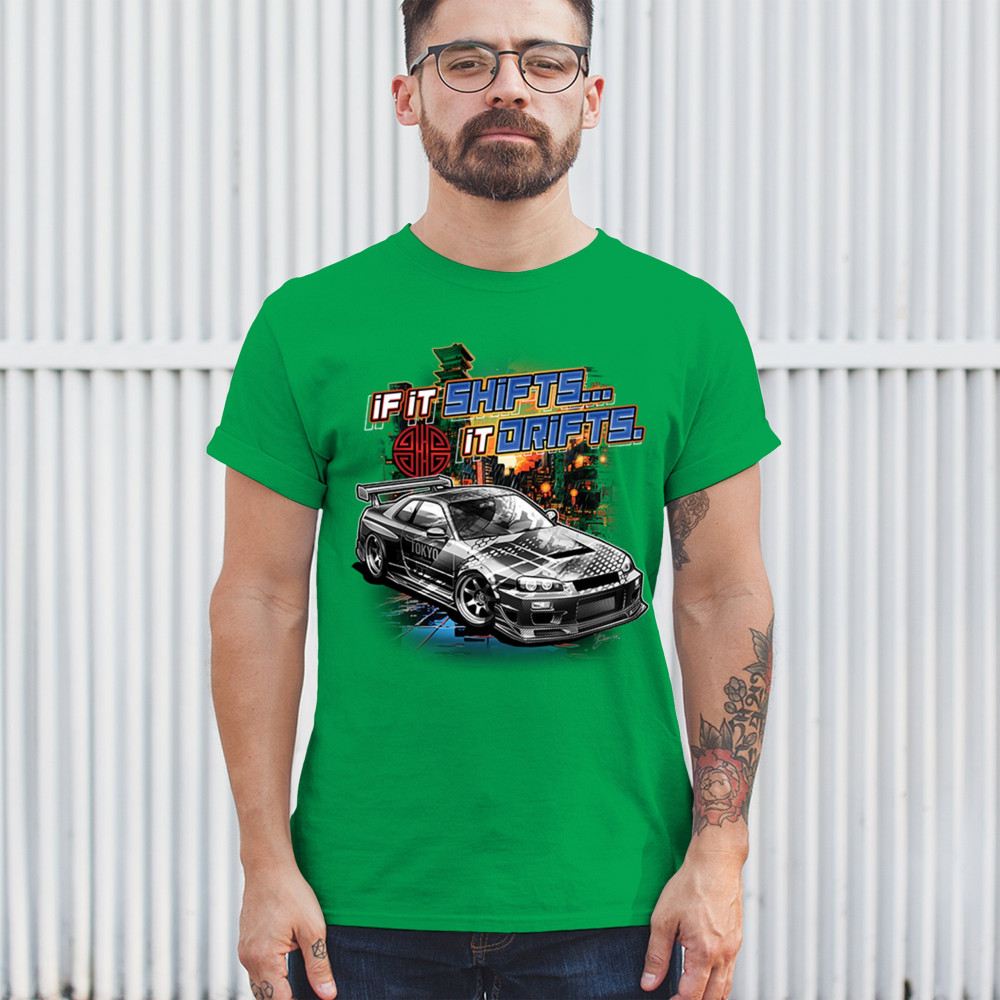 "If It Shifts, It Drifts" design. Perfect for car enthusiasts, featuring a detailed car and vibrant cityscape. Comfortable, durable, and stylish.