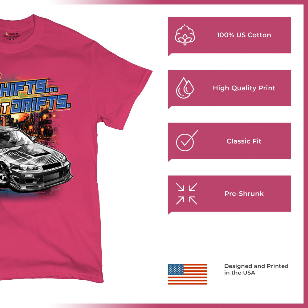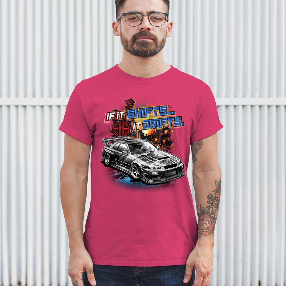 "If It Shifts, It Drifts" design. Perfect for car enthusiasts, featuring a detailed car and vibrant cityscape. Comfortable, durable, and stylish.