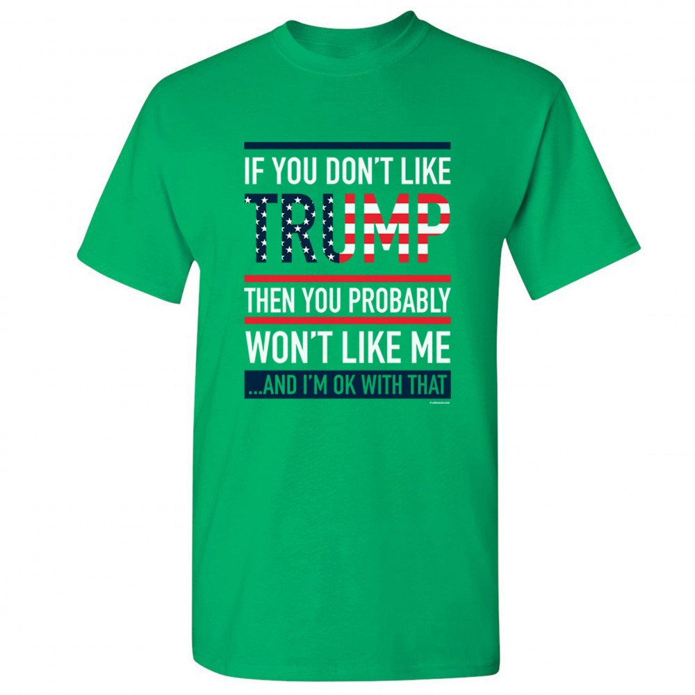 A political print saying "If You don't like Trump then you probably won't like me …and I'm ok with that". The word Trump is decorated with stars and stripes. A great choice to wear for a Trump rally or give as a gift to a Donald Trump and Mike Pence supporter before 2020 presidential elections.