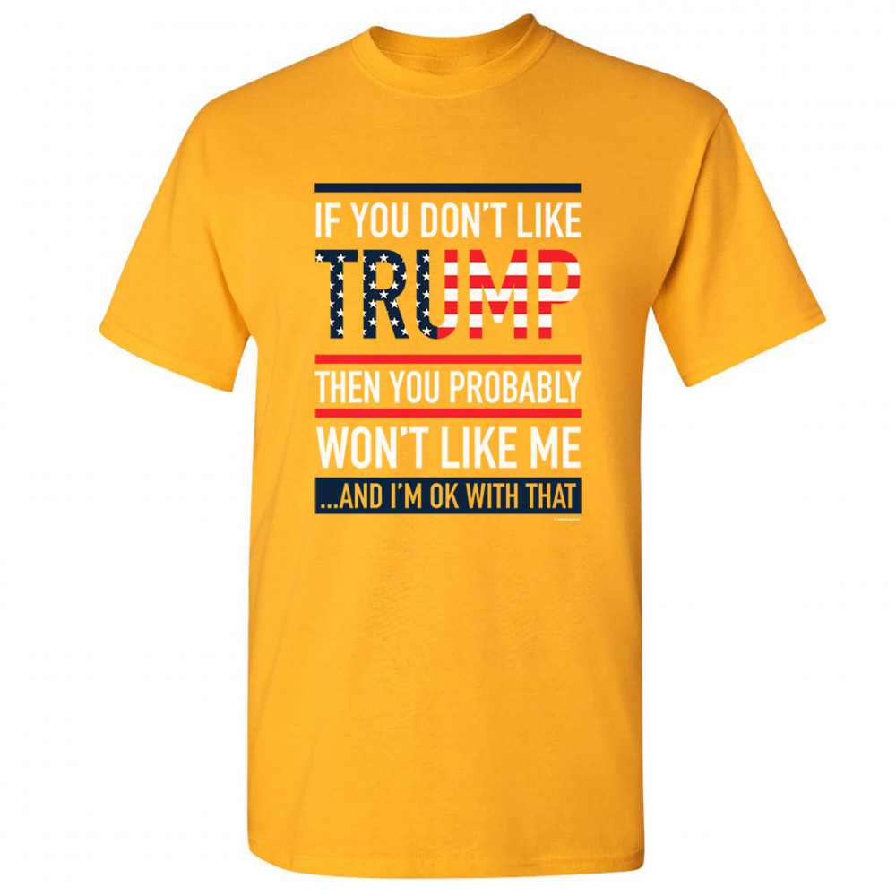 A political print saying "If You don't like Trump then you probably won't like me …and I'm ok with that". The word Trump is decorated with stars and stripes. A great choice to wear for a Trump rally or give as a gift to a Donald Trump and Mike Pence supporter before 2020 presidential elections.