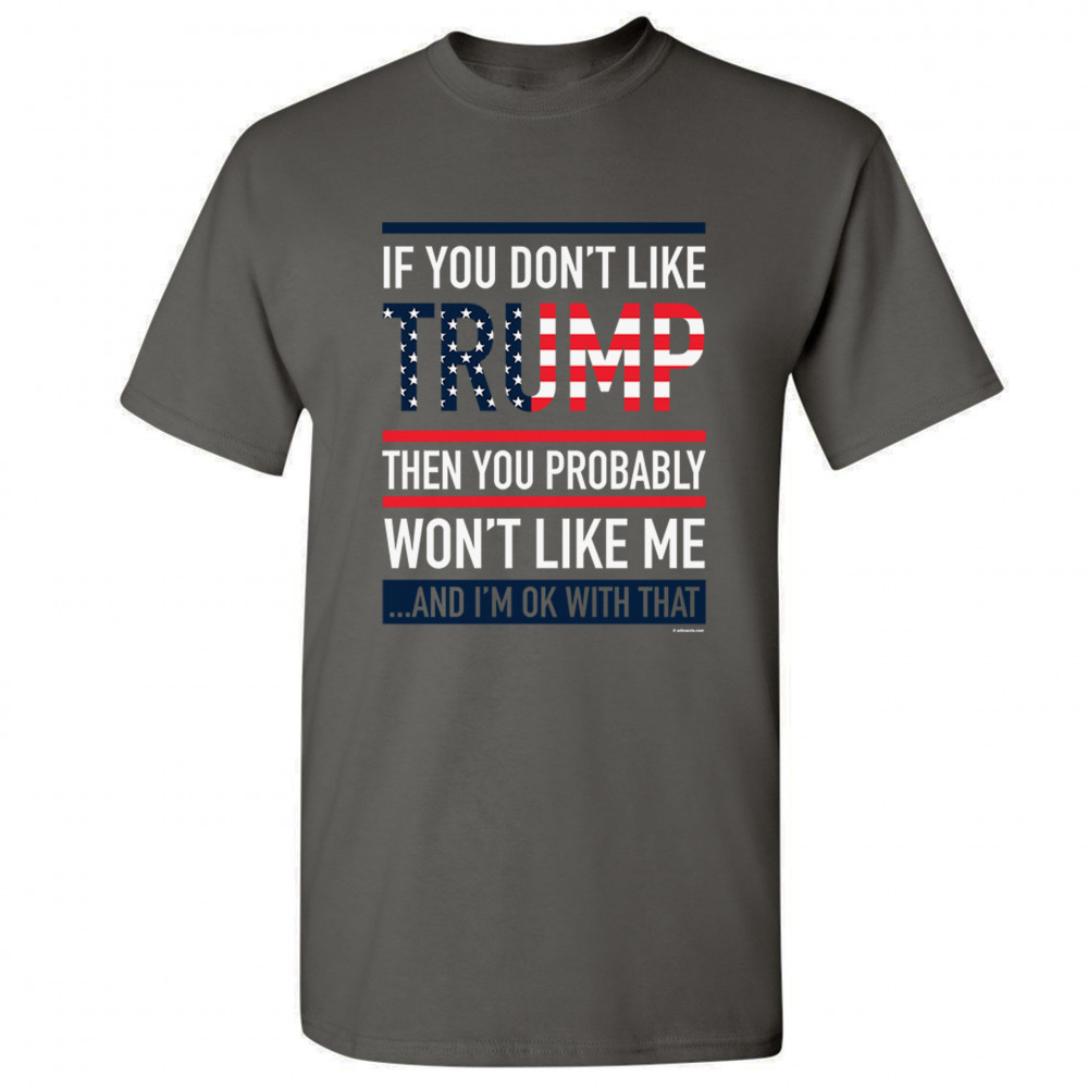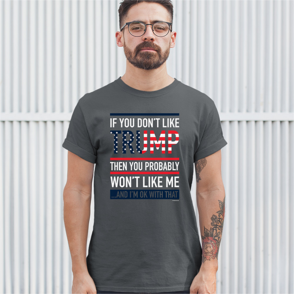 A political print saying "If You don't like Trump then you probably won't like me …and I'm ok with that". The word Trump is decorated with stars and stripes. A great choice to wear for a Trump rally or give as a gift to a Donald Trump and Mike Pence supporter before 2020 presidential elections.