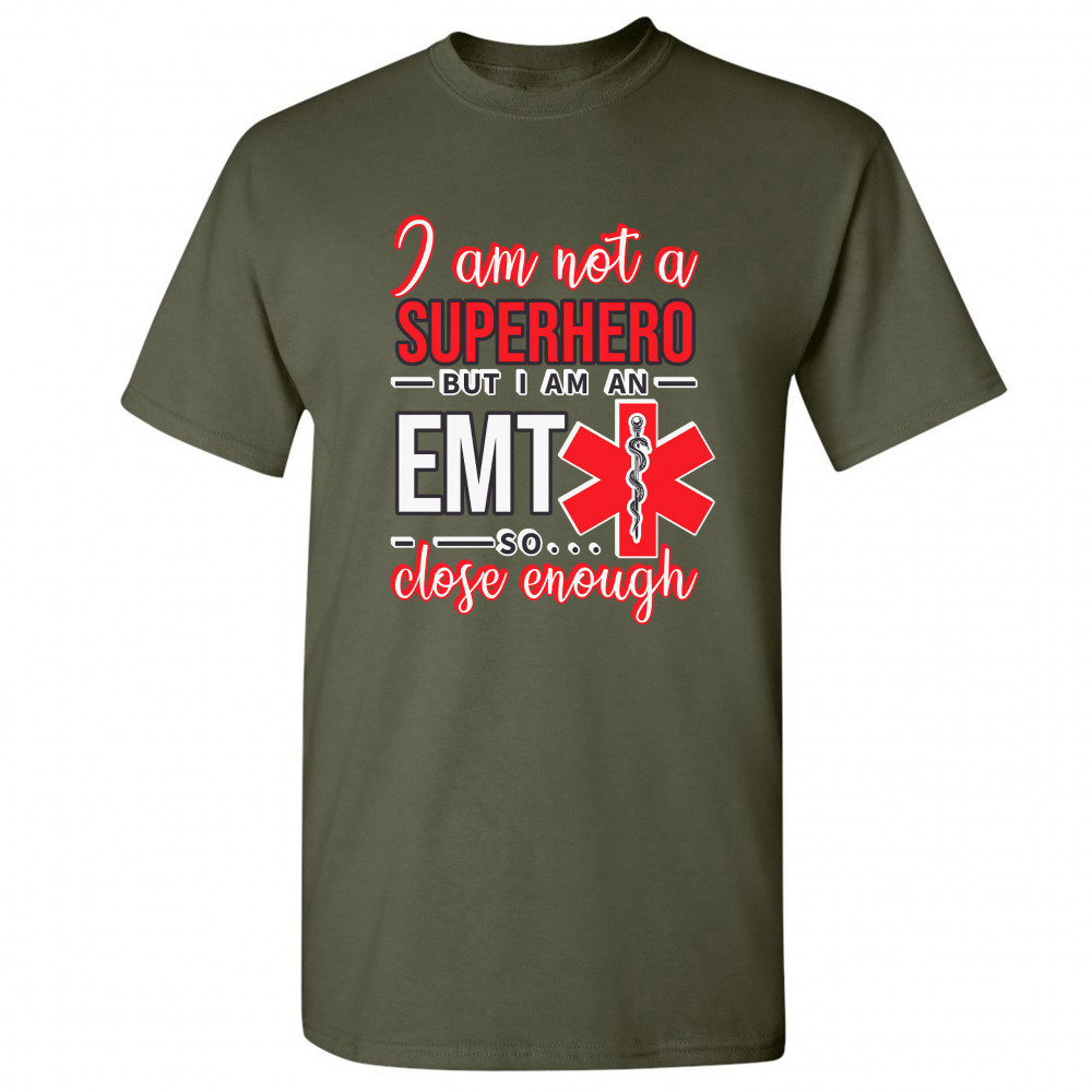 A funny print saying "I'm Not a Superhero But I'm an EMT so Close Enough". All words are written in different fonts. The print also includes the Star of Life, the worldwide recognized symbol of emergency medical services, with the Rod of Asclepius inside of it. A great choice as a gift for a first responder.