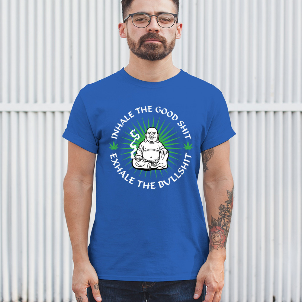 This hilarious and zen-inspired design features a happy Buddha with a joint, surrounded by cannabis leaves. “Inhale the Good Shit, Exhale the Bullshit†delivers chill stoner wisdom with a wink. Ideal for mindful marijuana lovers, 420 fans, or spiritual rebels with a sense of humor and a love for weed.