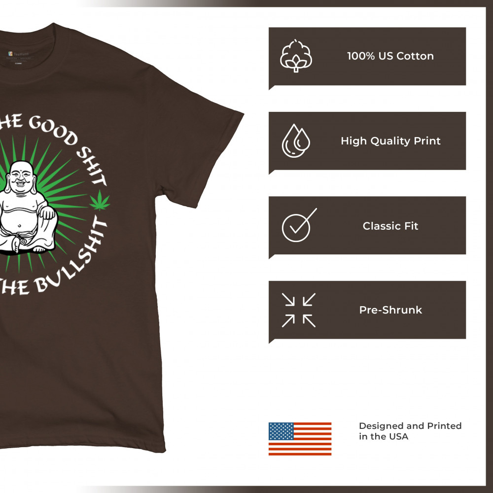 This hilarious and zen-inspired design features a happy Buddha with a joint, surrounded by cannabis leaves. “Inhale the Good Shit, Exhale the Bullshit†delivers chill stoner wisdom with a wink. Ideal for mindful marijuana lovers, 420 fans, or spiritual rebels with a sense of humor and a love for weed.
