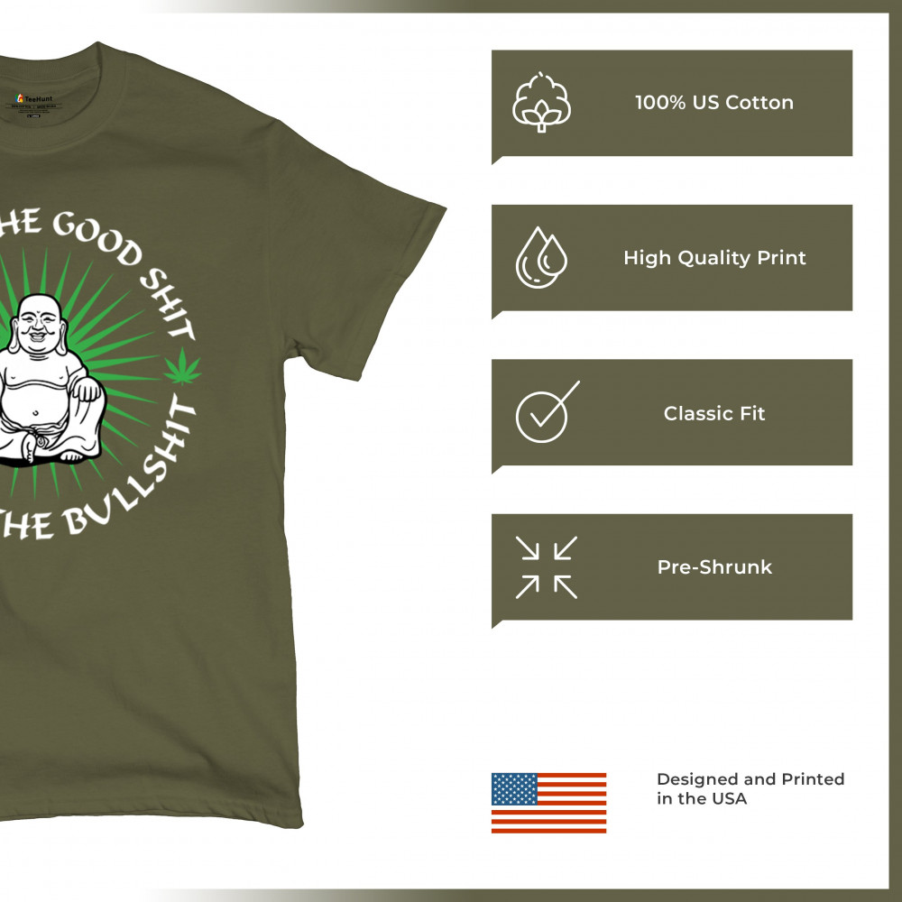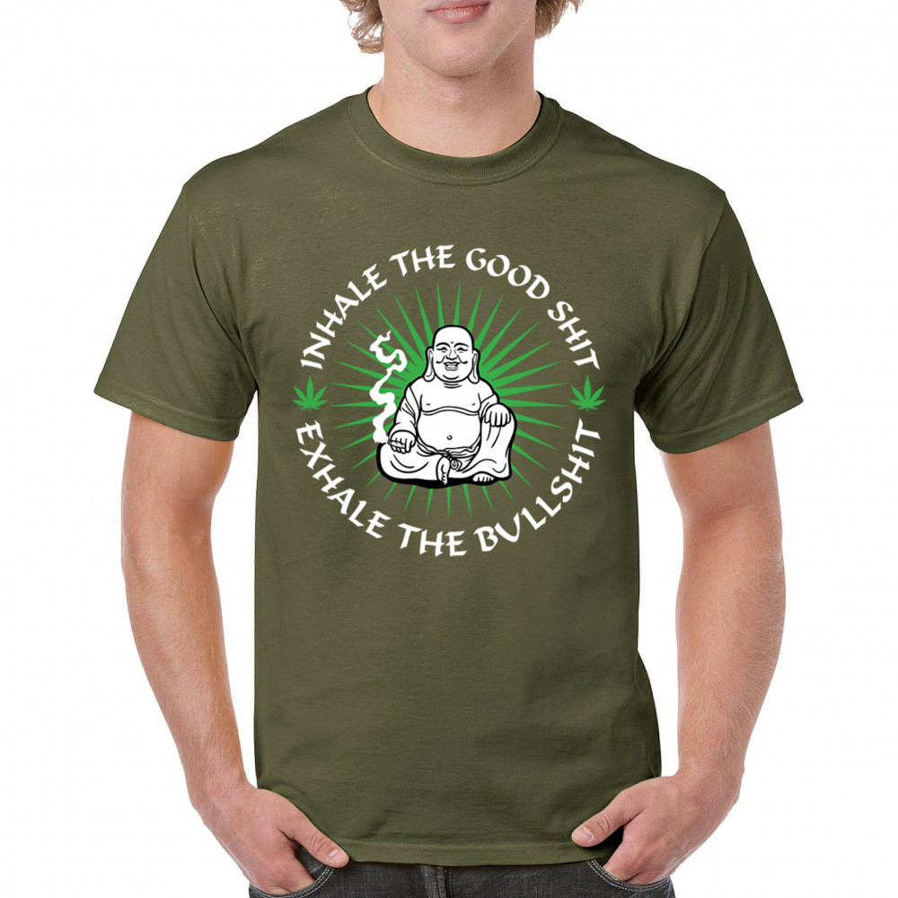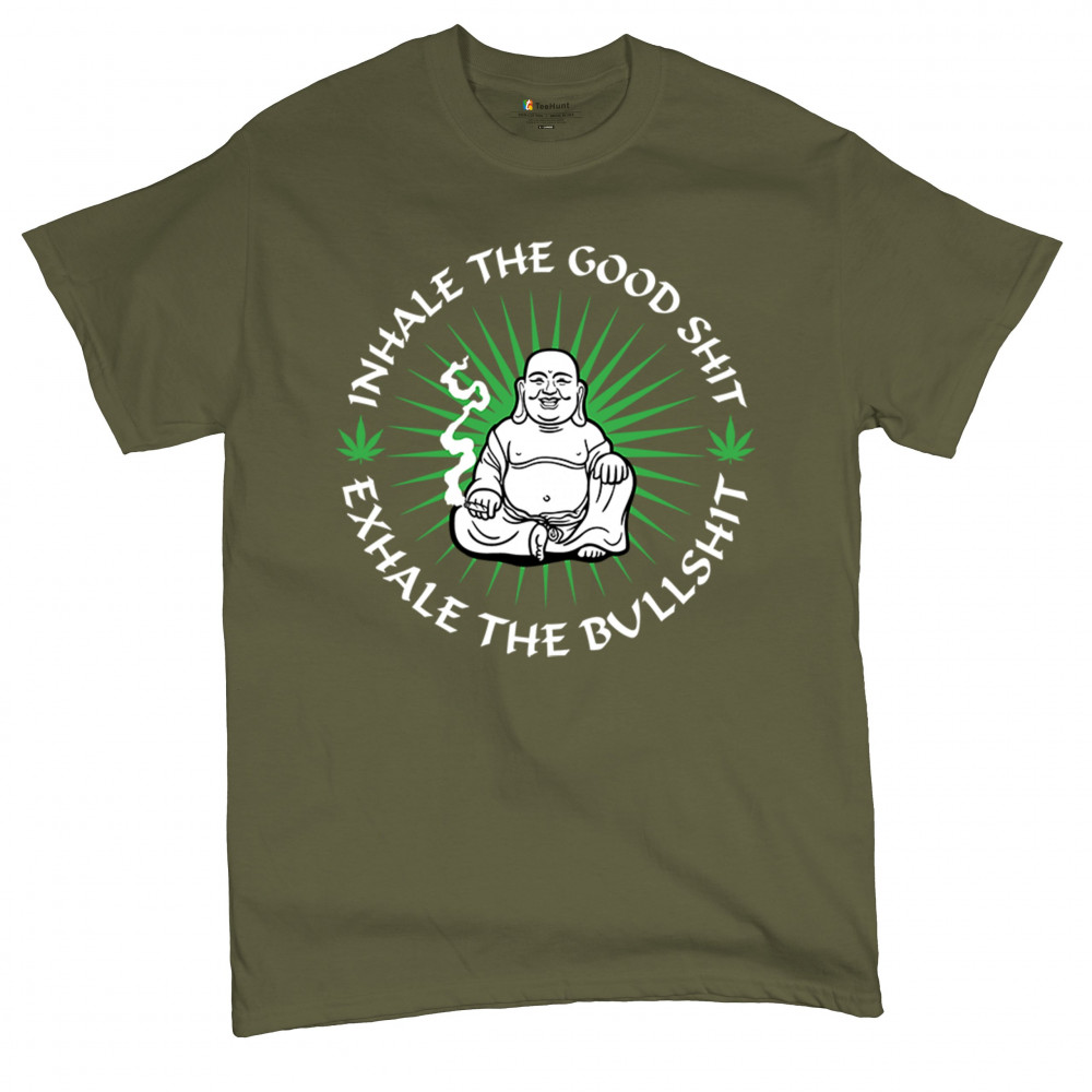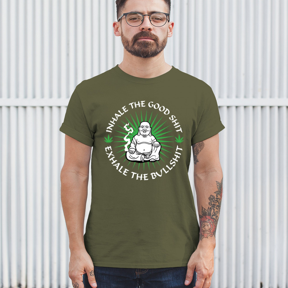 This hilarious and zen-inspired design features a happy Buddha with a joint, surrounded by cannabis leaves. “Inhale the Good Shit, Exhale the Bullshit†delivers chill stoner wisdom with a wink. Ideal for mindful marijuana lovers, 420 fans, or spiritual rebels with a sense of humor and a love for weed.