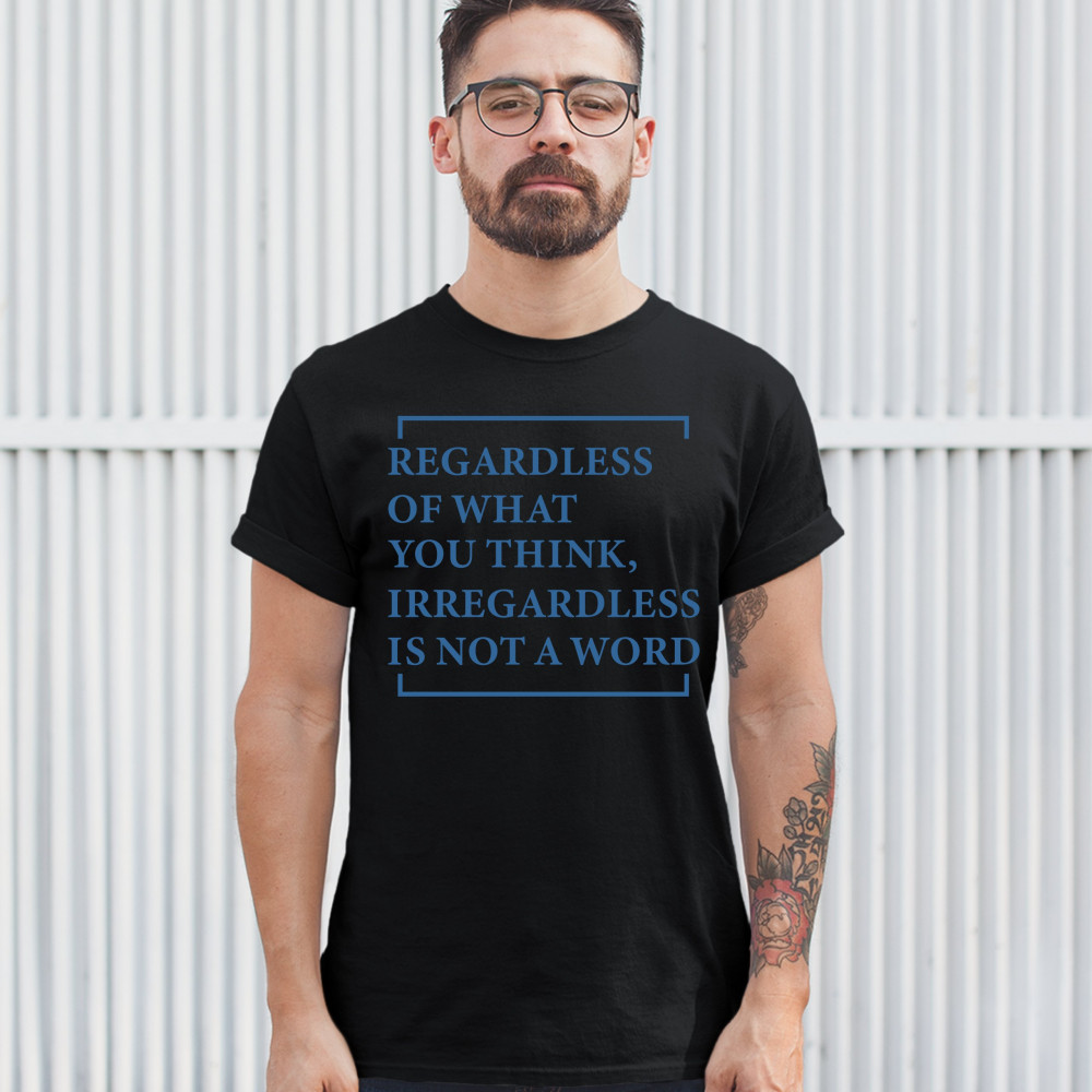 A funny print saying "regardless of what You think, irregardless is not a word". A great choice to wear to make people smile.