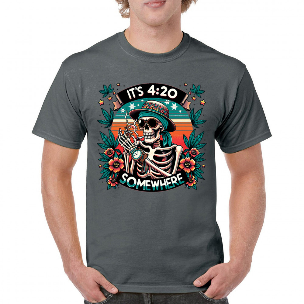 Get lifted with this “It’s 4:20 Somewhere†design featuring a joint-smoking skeleton, tropical sunset, and Deadhead stoner vibes. With bold trippy colors and beachy weed art, this tee is perfect for April 20 parties, summer festivals, and cannabis lovers living the high life.