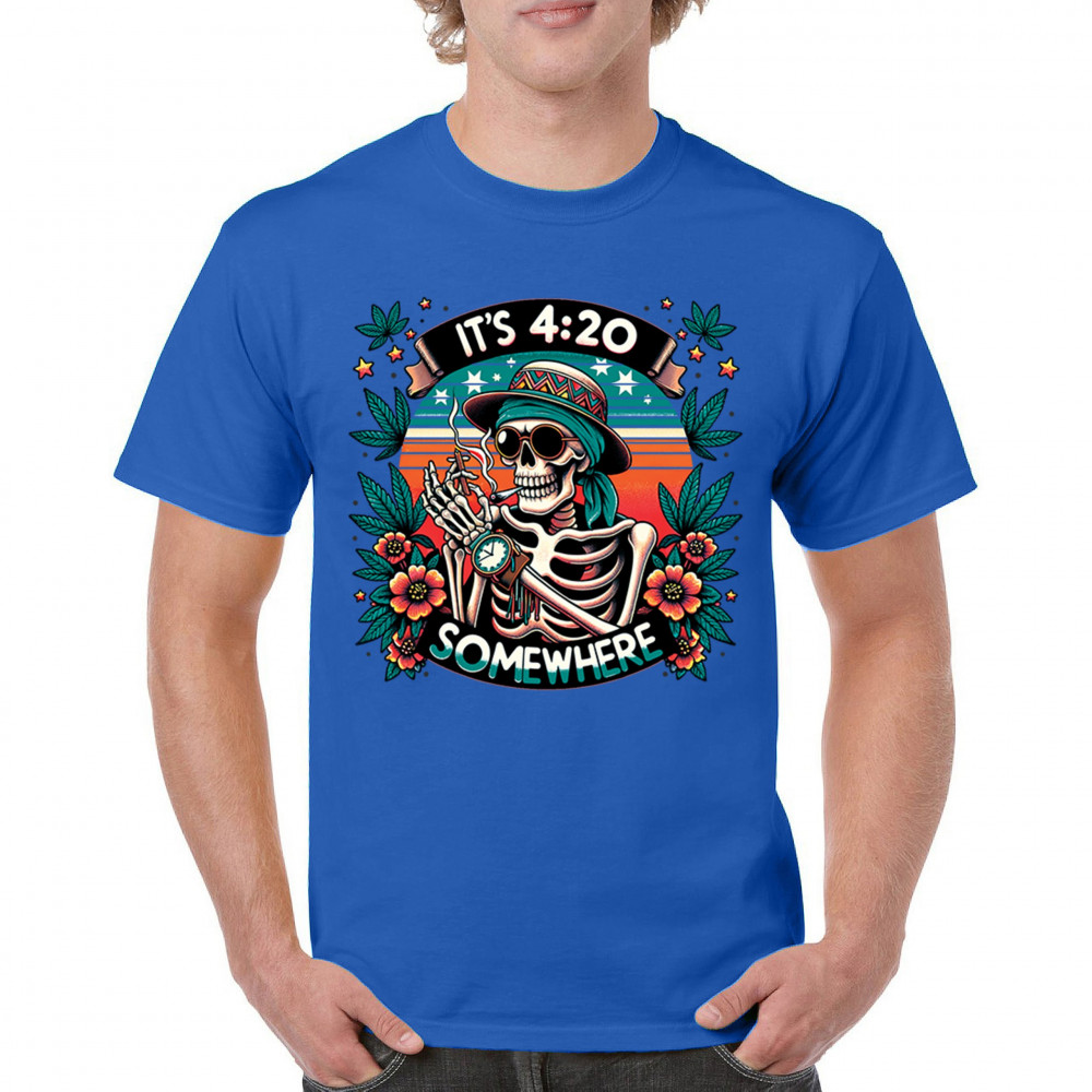 Get lifted with this “It’s 4:20 Somewhere†design featuring a joint-smoking skeleton, tropical sunset, and Deadhead stoner vibes. With bold trippy colors and beachy weed art, this tee is perfect for April 20 parties, summer festivals, and cannabis lovers living the high life.