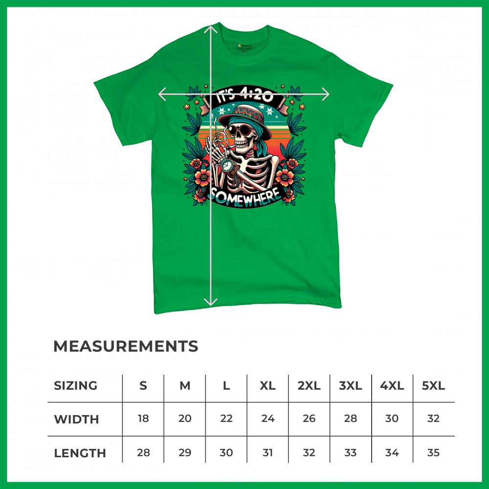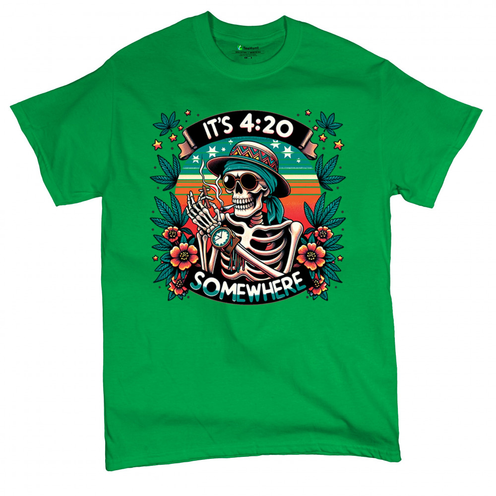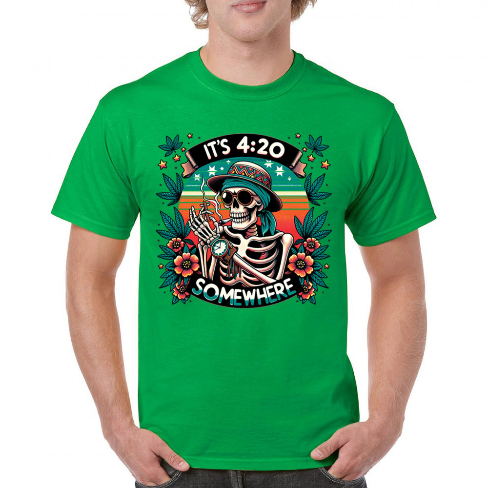 Get lifted with this “It’s 4:20 Somewhere†design featuring a joint-smoking skeleton, tropical sunset, and Deadhead stoner vibes. With bold trippy colors and beachy weed art, this tee is perfect for April 20 parties, summer festivals, and cannabis lovers living the high life.