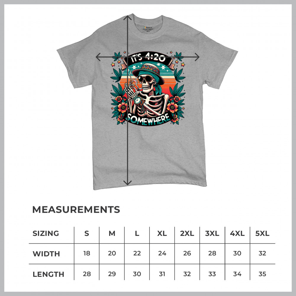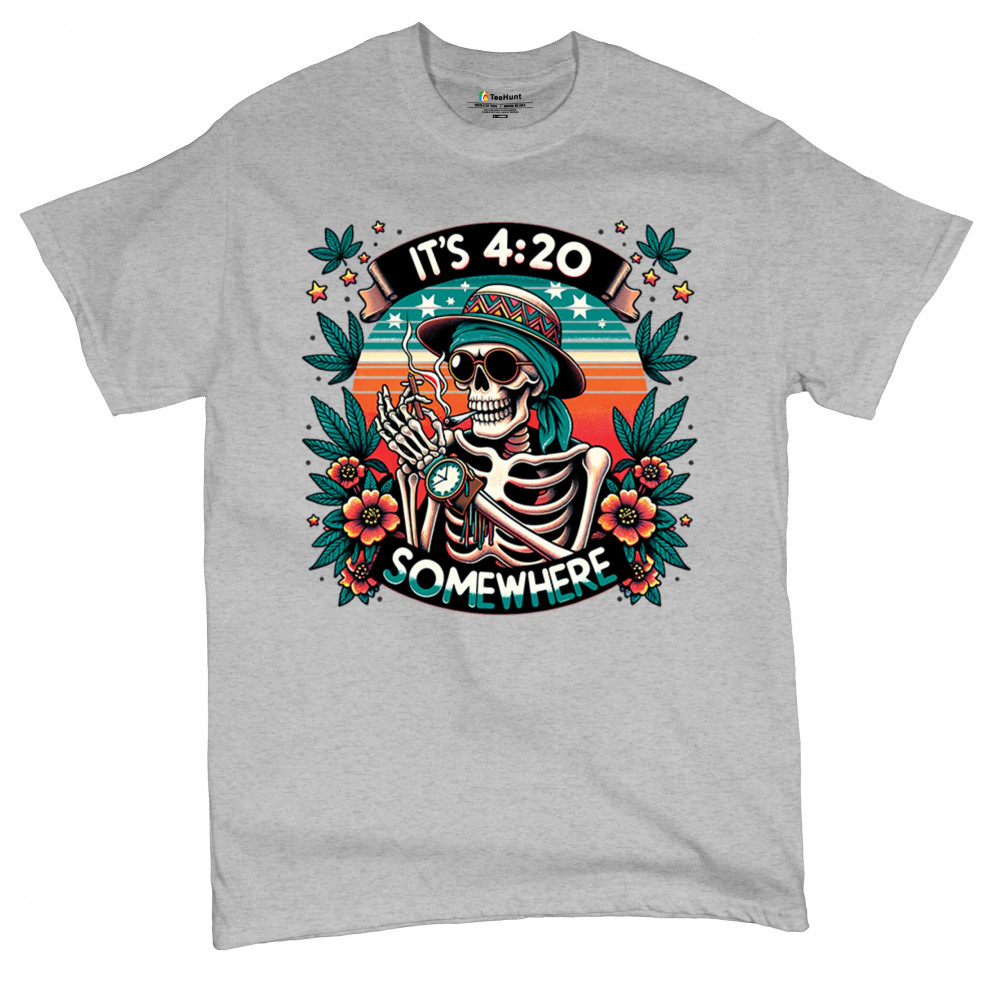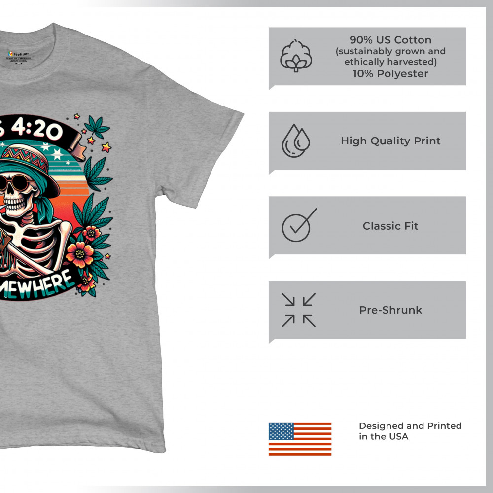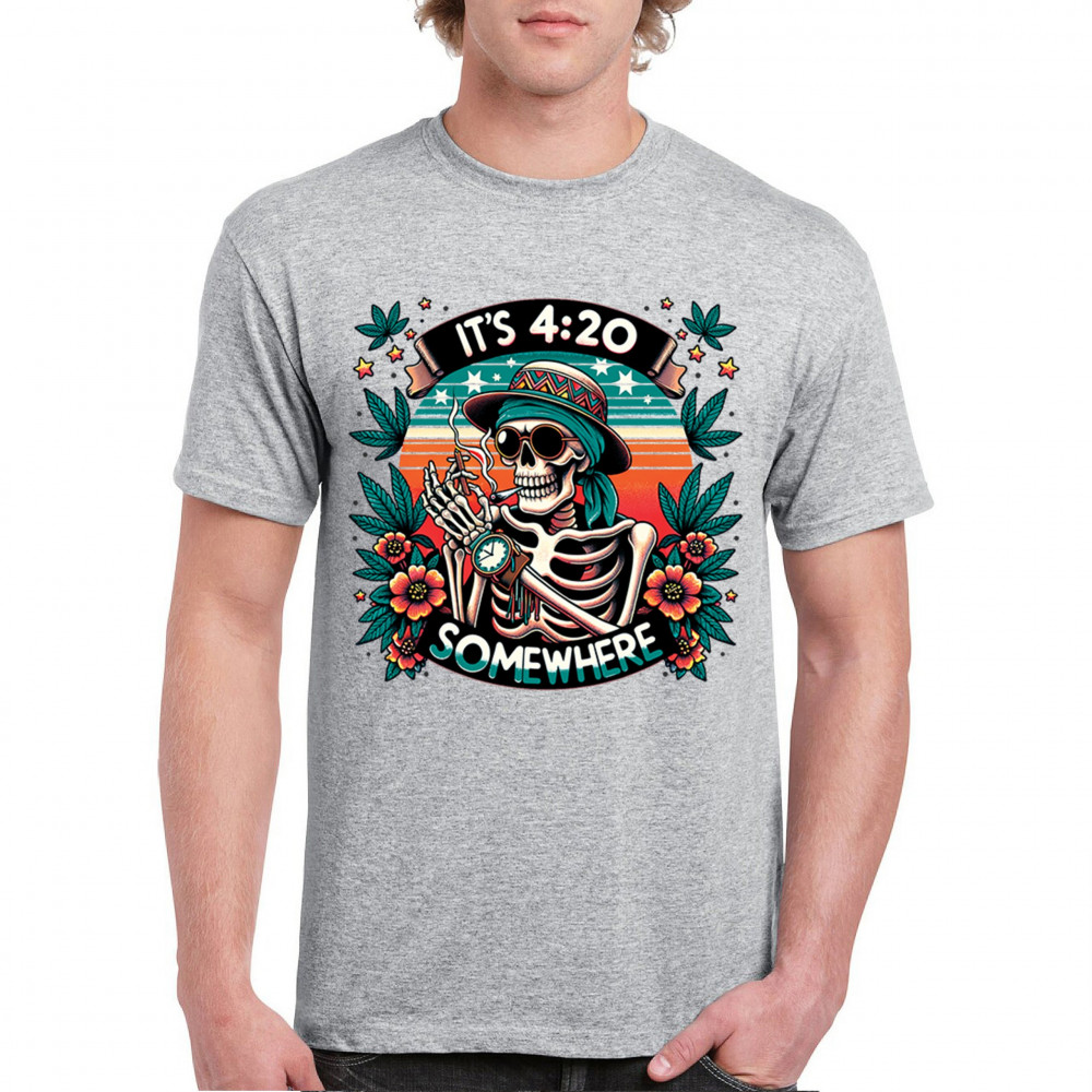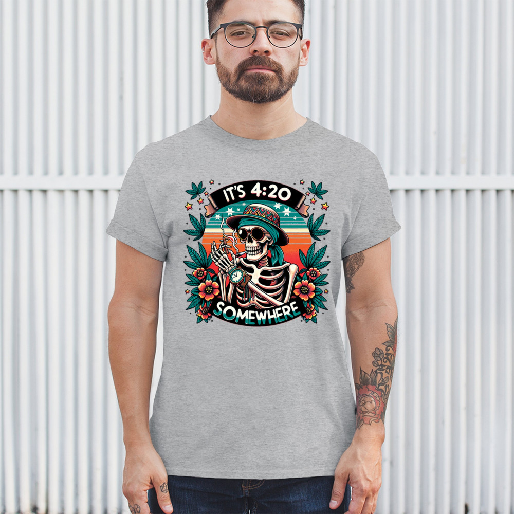 Get lifted with this “It’s 4:20 Somewhere†design featuring a joint-smoking skeleton, tropical sunset, and Deadhead stoner vibes. With bold trippy colors and beachy weed art, this tee is perfect for April 20 parties, summer festivals, and cannabis lovers living the high life.