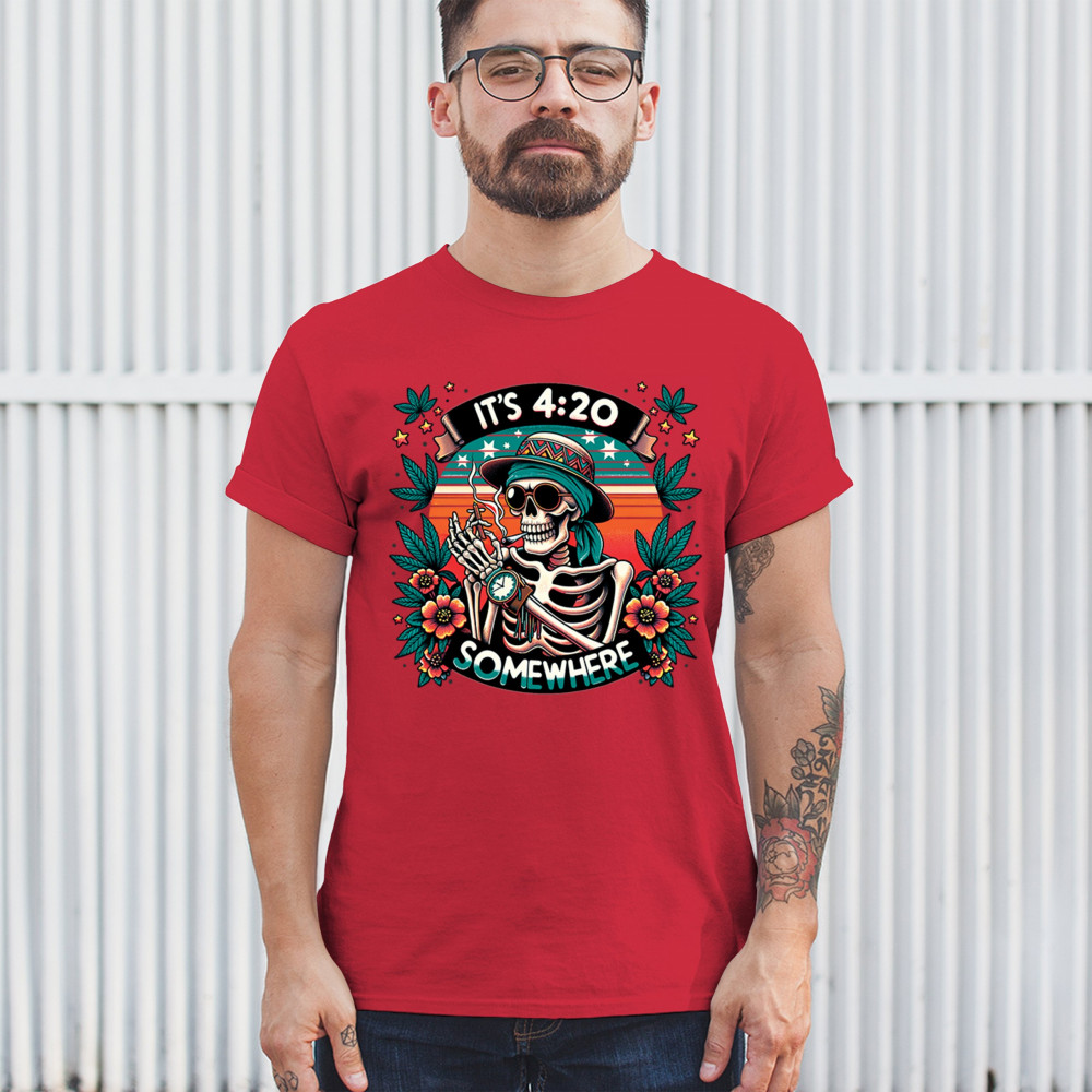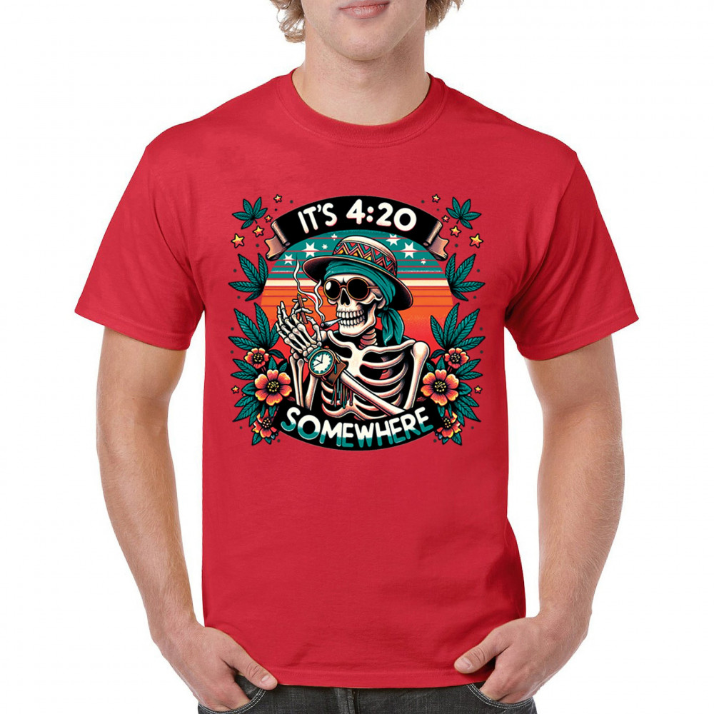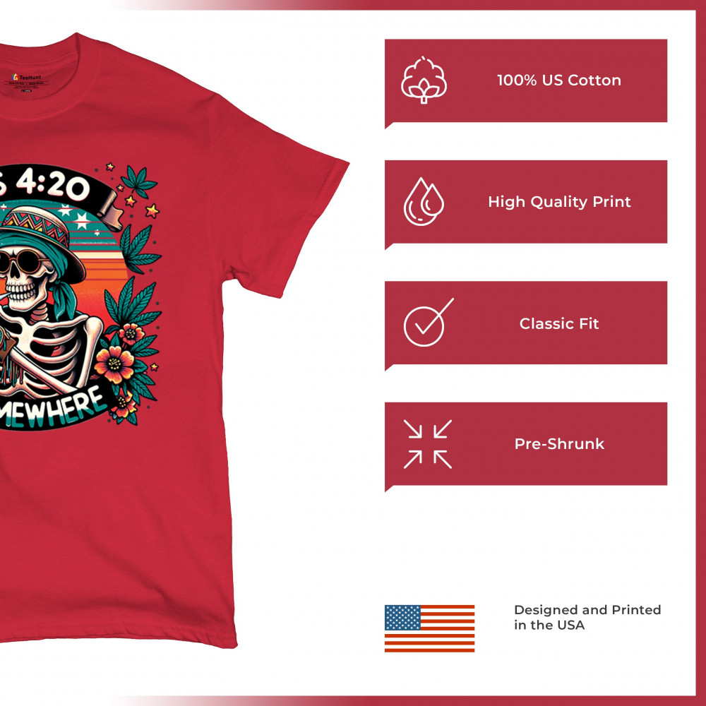 Get lifted with this “It’s 4:20 Somewhere†design featuring a joint-smoking skeleton, tropical sunset, and Deadhead stoner vibes. With bold trippy colors and beachy weed art, this tee is perfect for April 20 parties, summer festivals, and cannabis lovers living the high life.